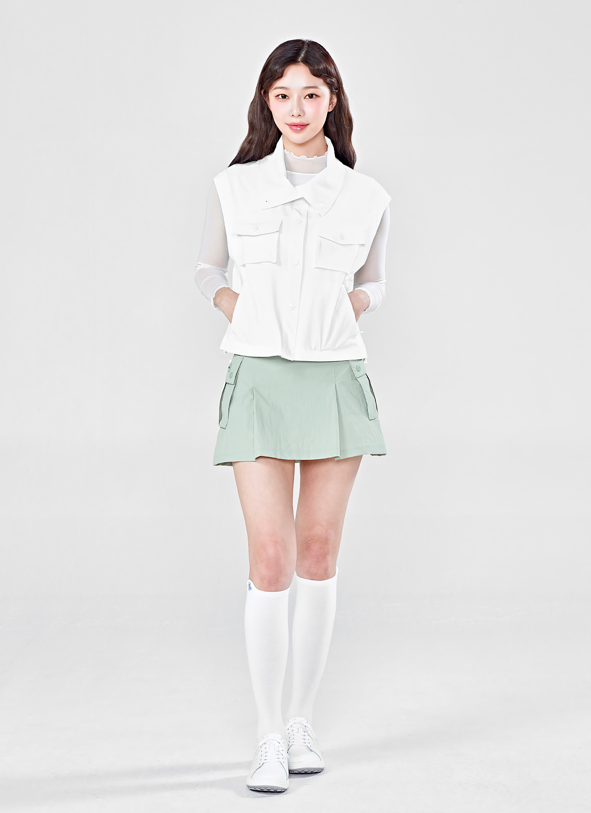 04 "이너 쇼츠가 있어 안심이죠!" 스커트 안쪽에 이너 쇼츠가 결합된 투인원 스타일로, 스윙 동작이나 카트 착석 시 노출 부담을 줄여줘요.