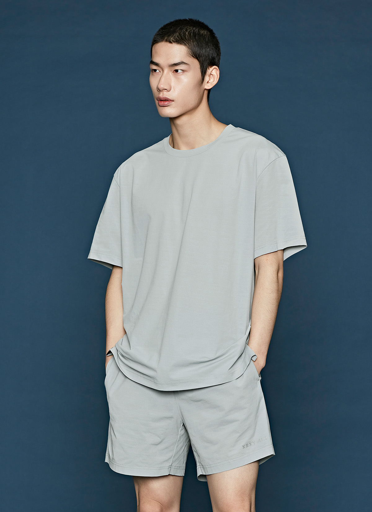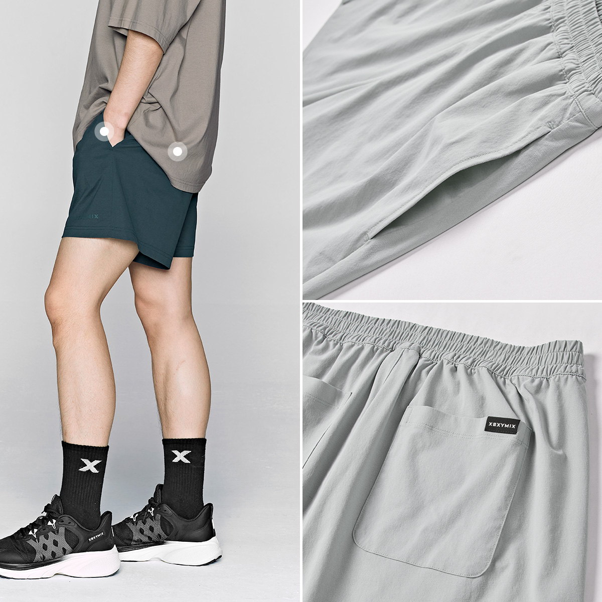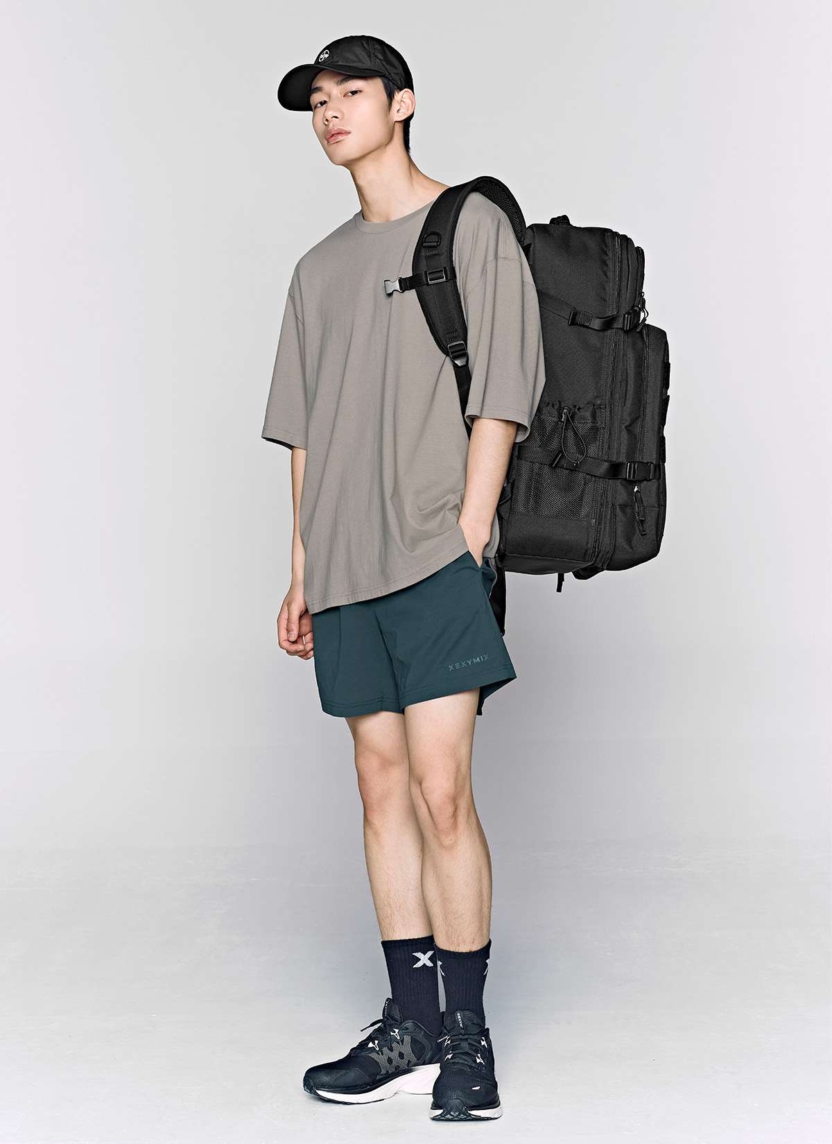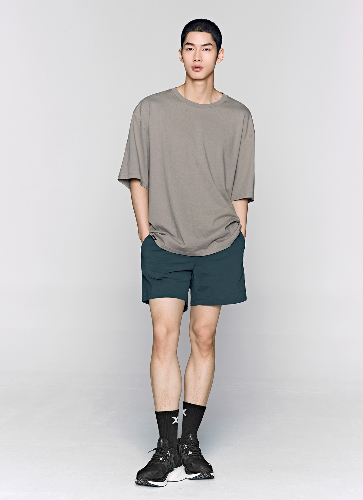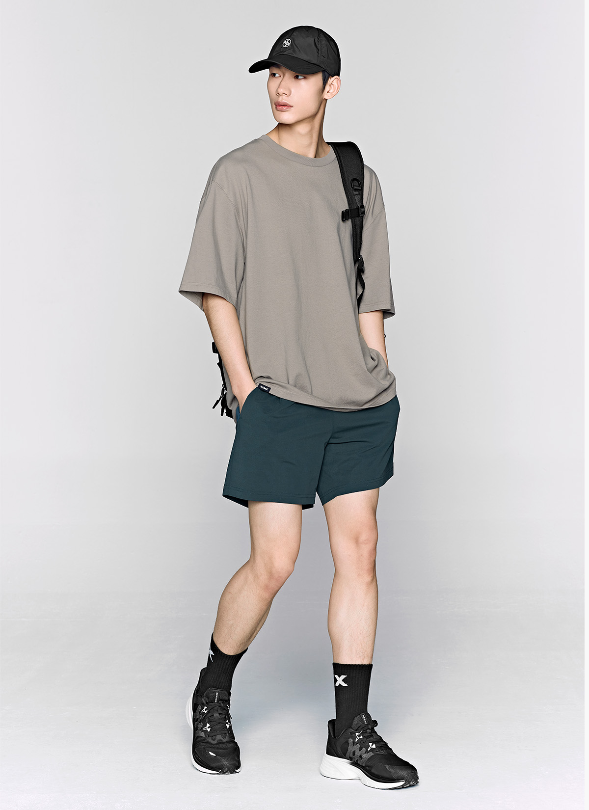 허벅지를 덮는 여유로운 쇼츠 기장이 안정적인 착용감을 주며,