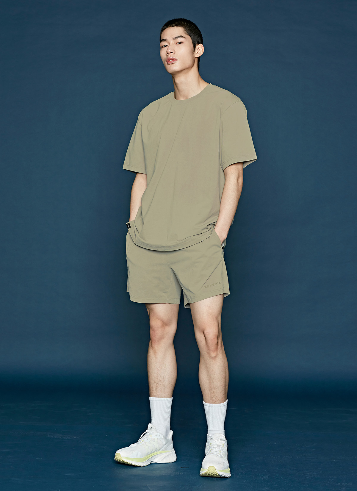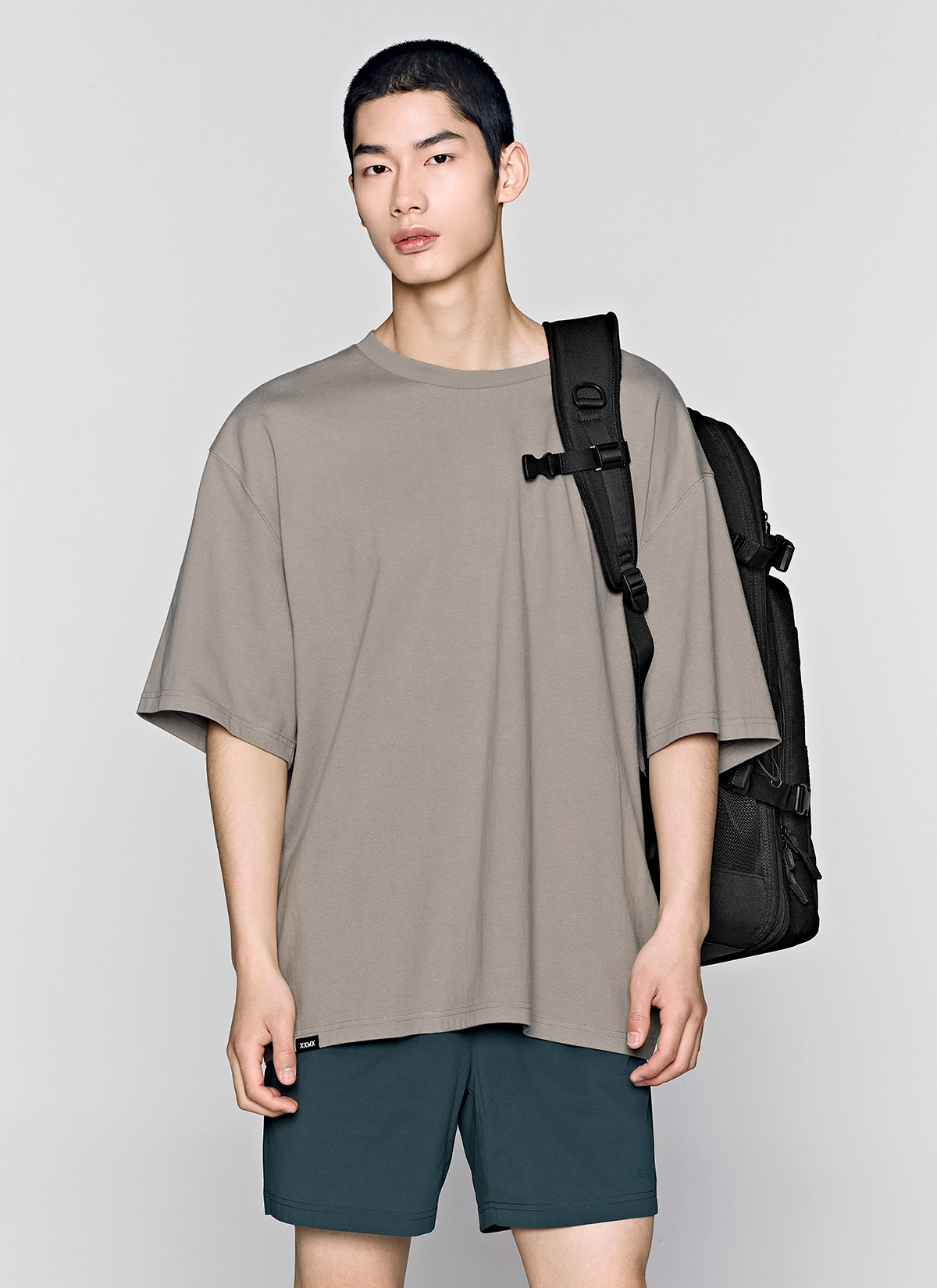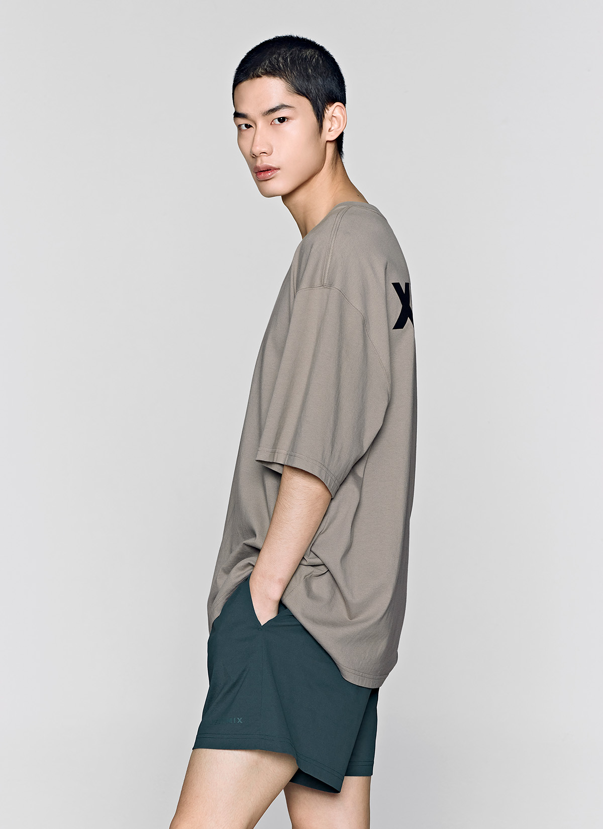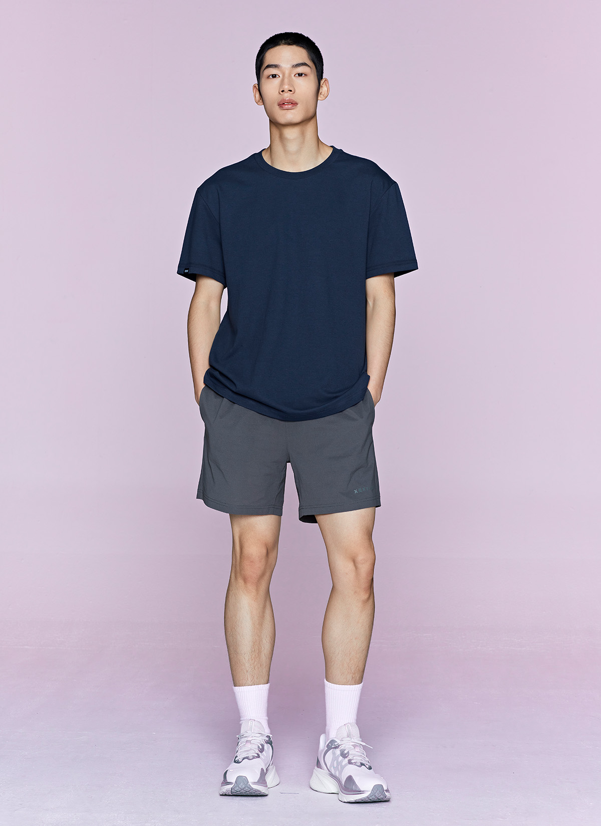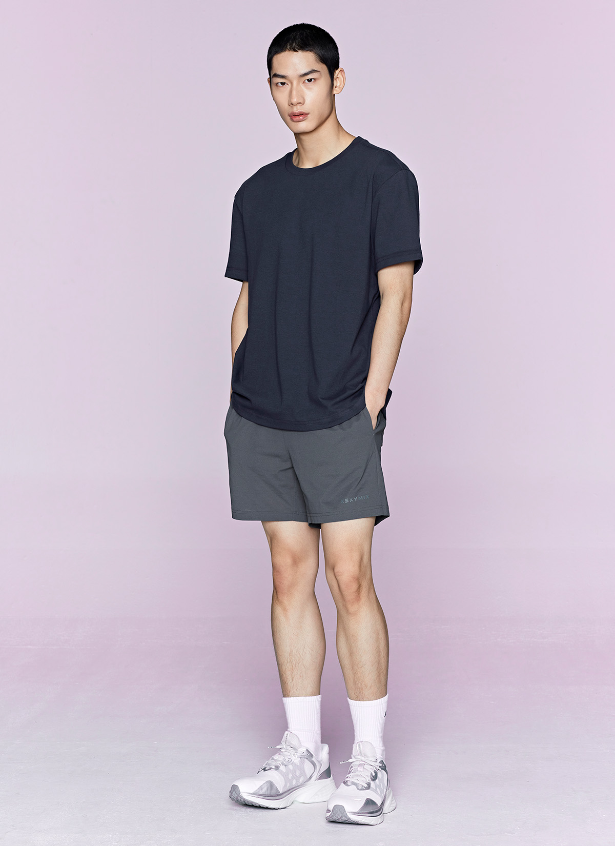 허벅지를 덮는 여유로운 쇼츠 기장이 안정적인 착용감을 주며,