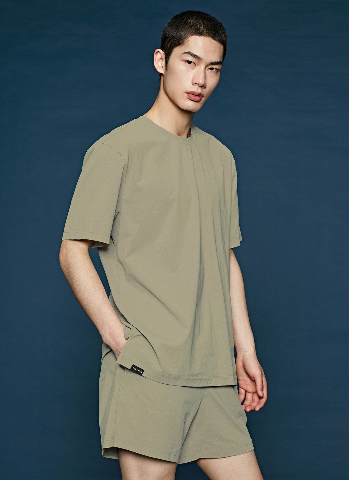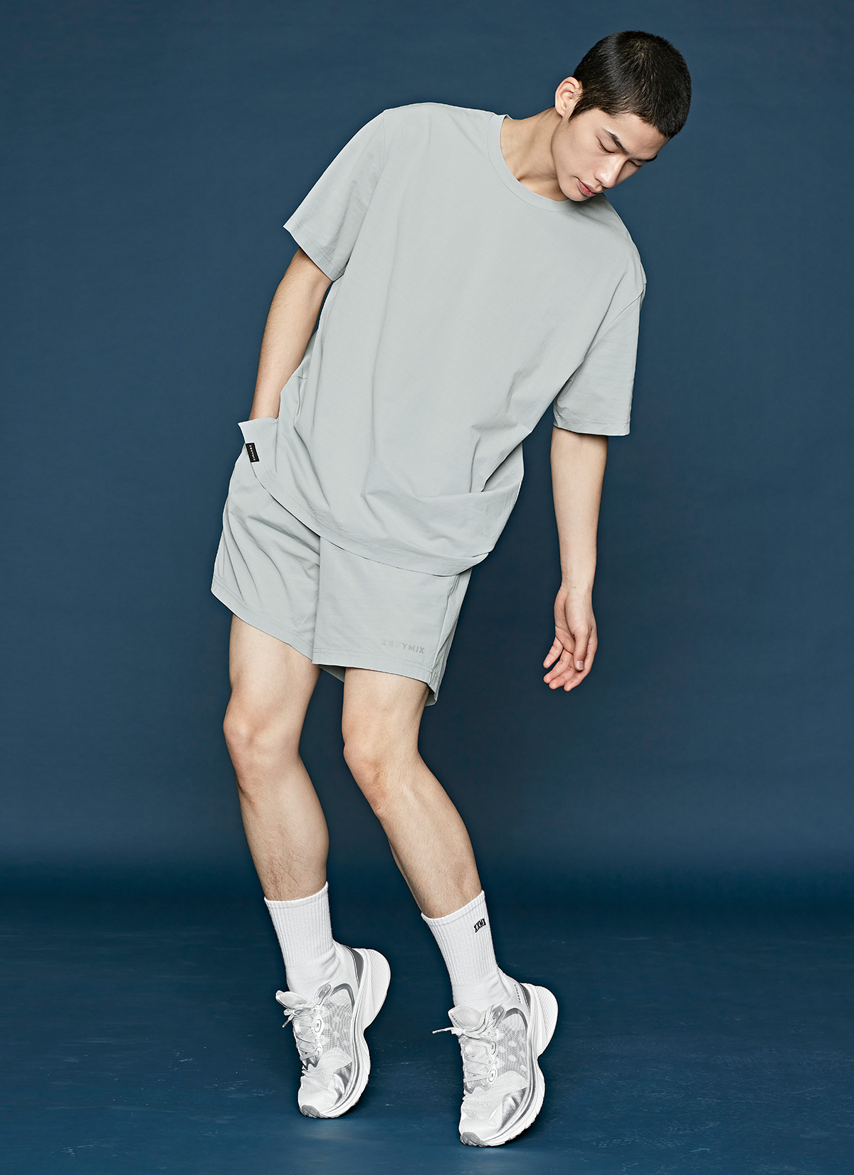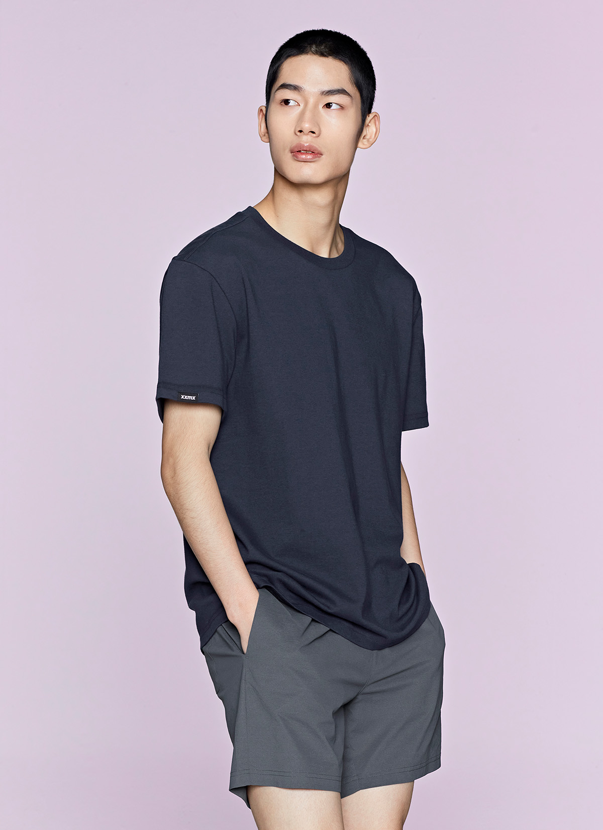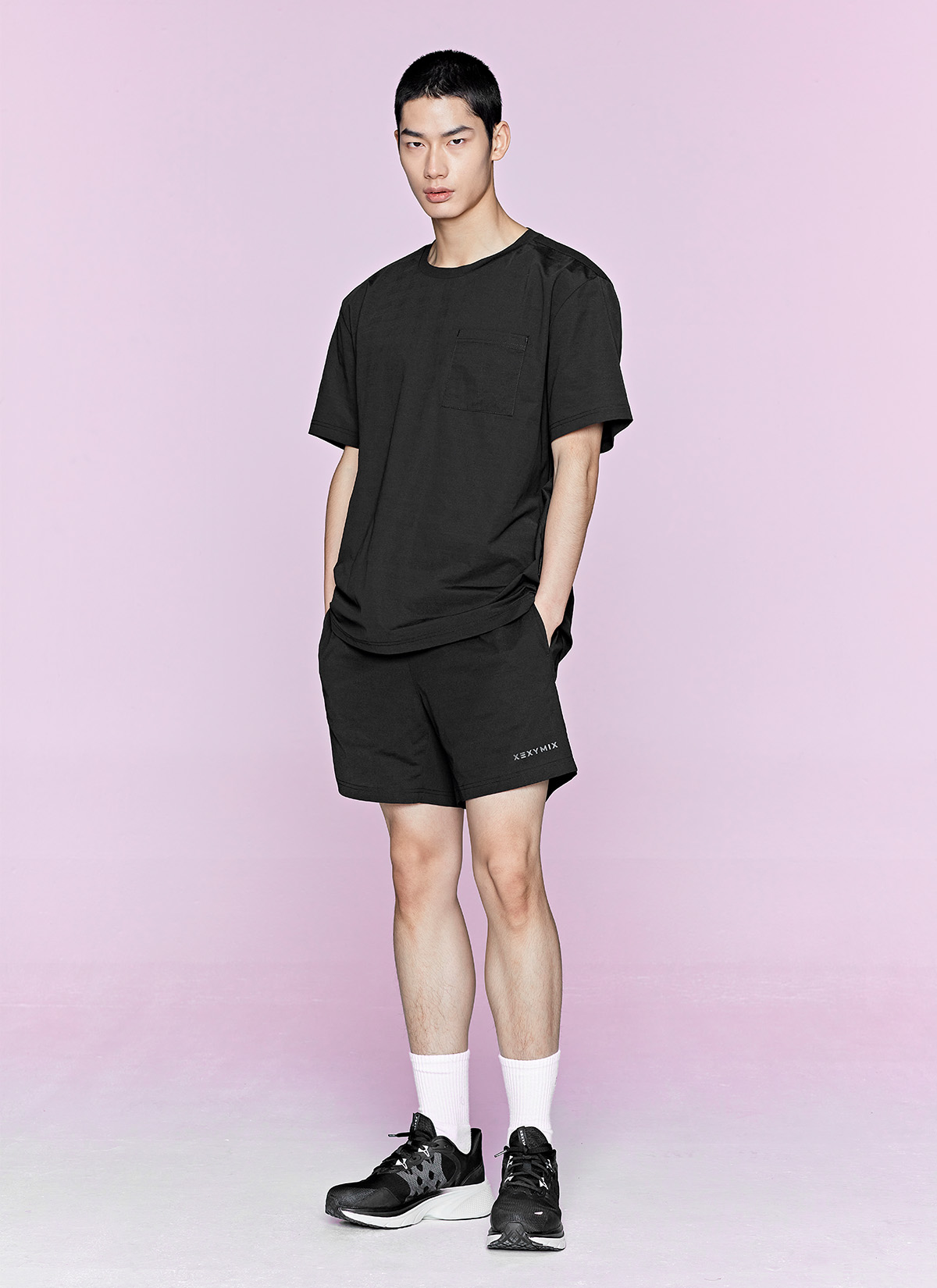 허벅지를 덮는 여유로운 쇼츠 기장이 안정적인 착용감을 주며,