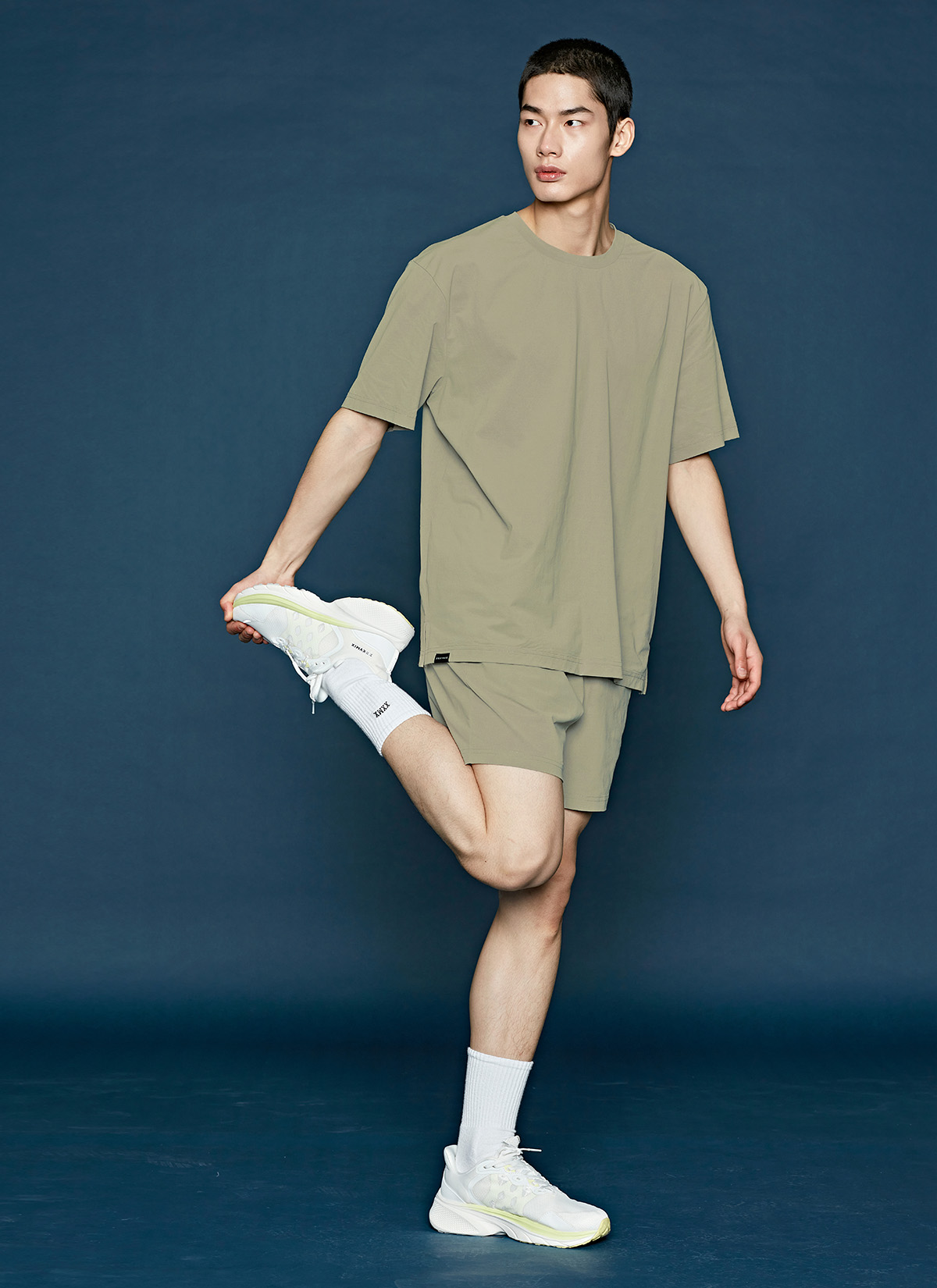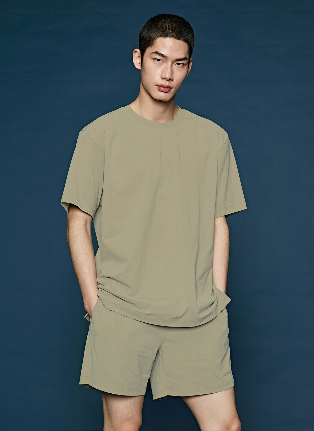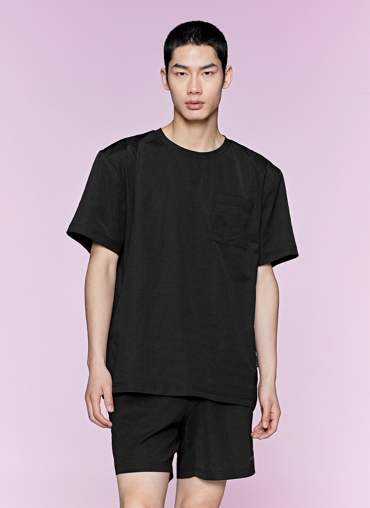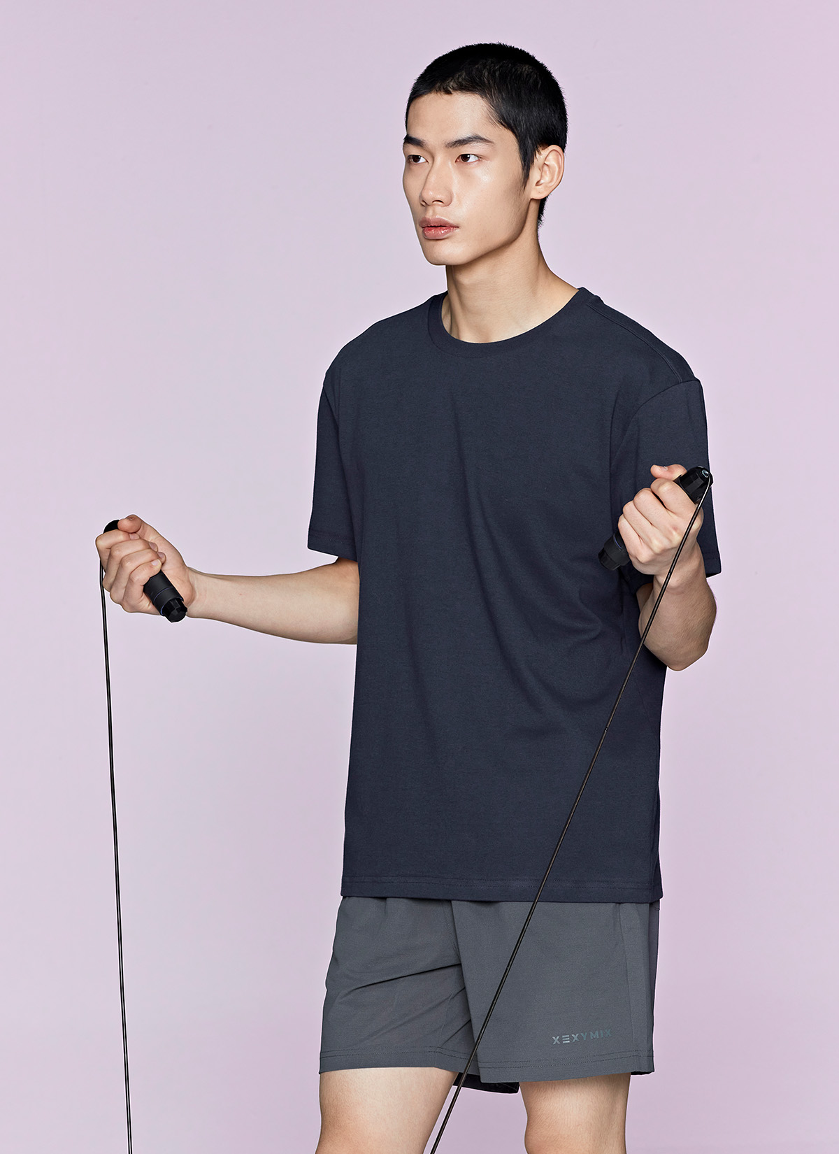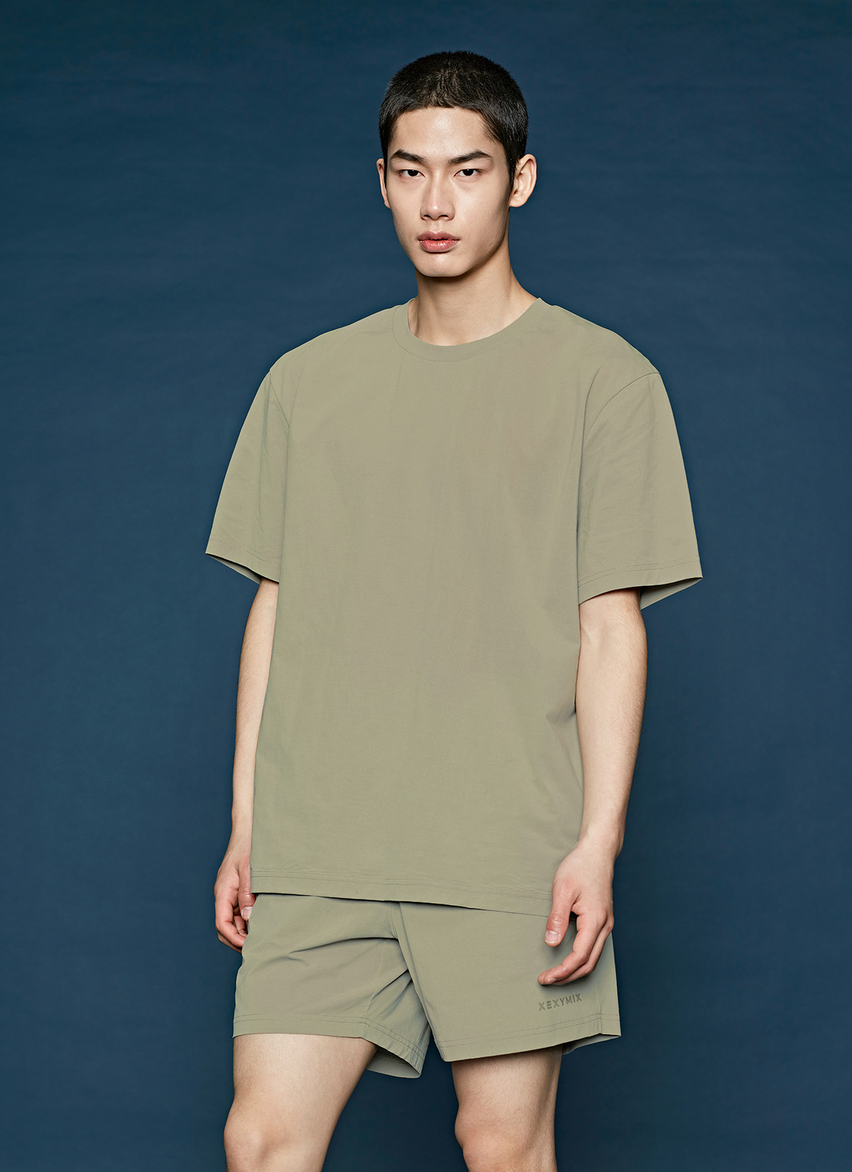 허벅지를 덮는 여유로운 쇼츠 기장이 안정적인 착용감을 주며,