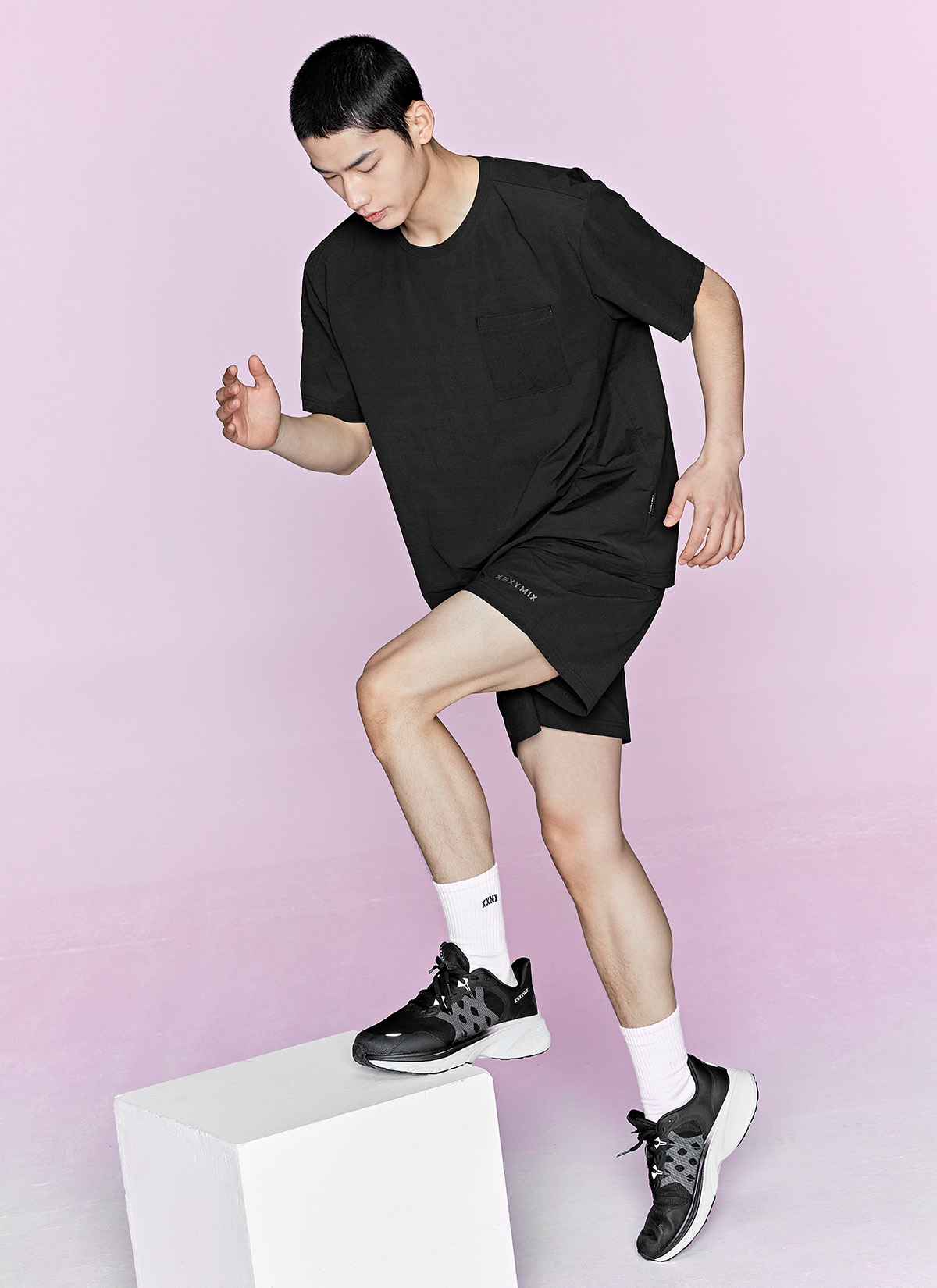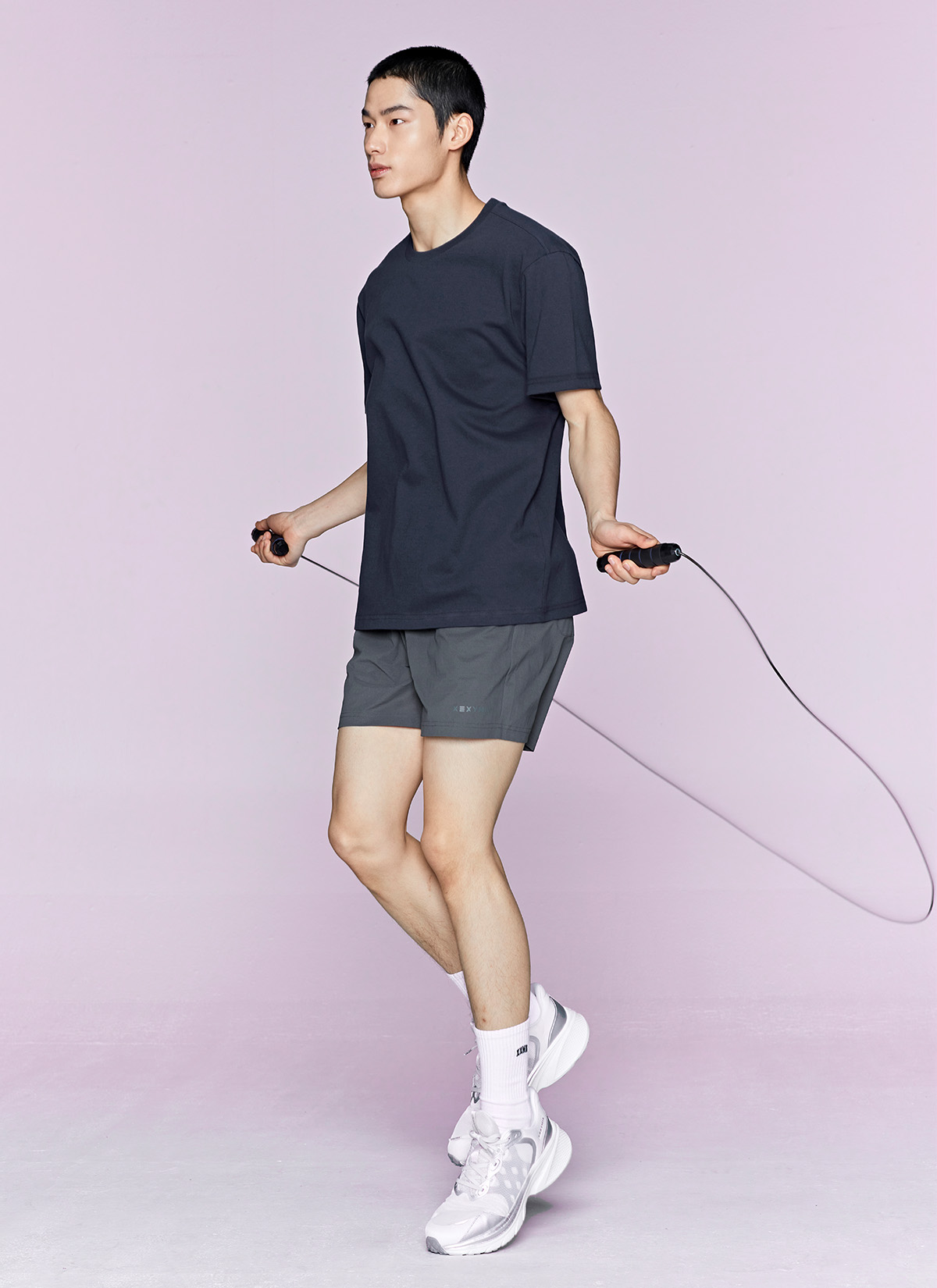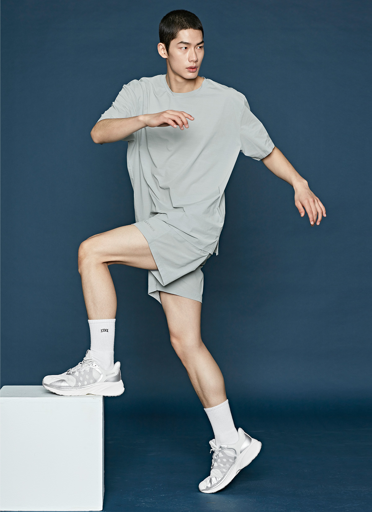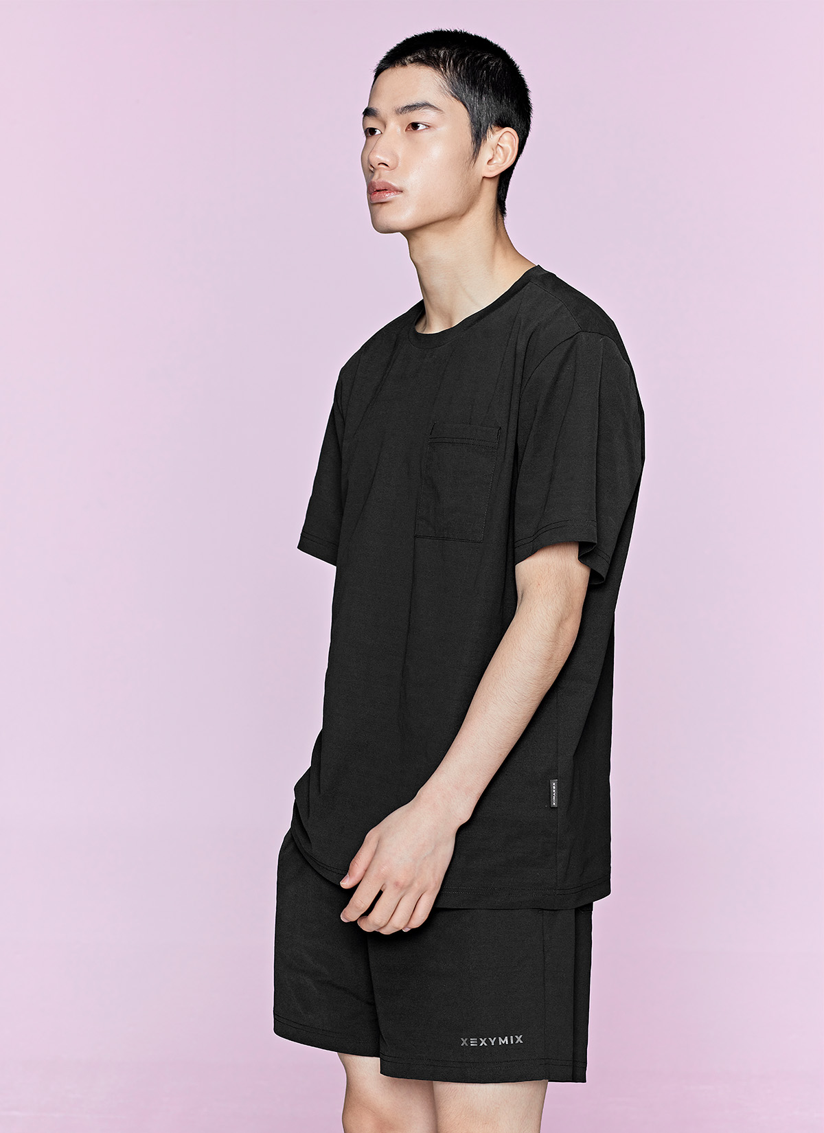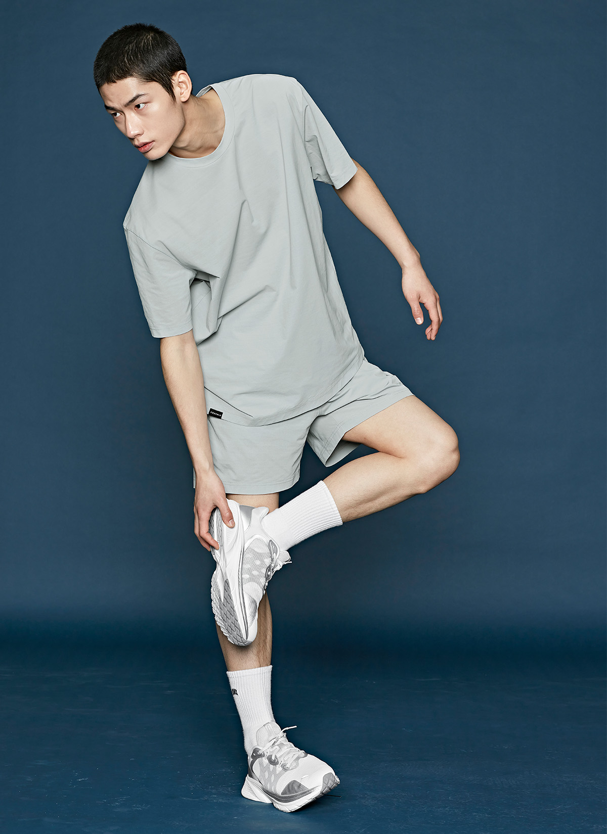 허벅지를 덮는 여유로운 쇼츠 기장이 안정적인 착용감을 주며,