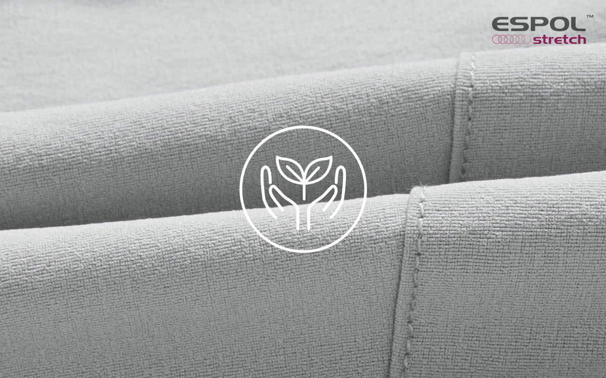 변색 01 "지금까지 느껴본 적 없던 편안함" 국내 휴비스(Huvis)사의 에스폴-스트레치(Espol-stretch)는 듀폰(Dupont)사의 친환경 소재인 소로나를 원료로 하여, 특수 방사 기술을 통해 기존 탄성사와는 차별화된 편안한 신축성과 우수한 회복성을 부여한 원사예요.