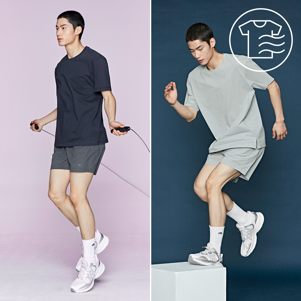 03 "땀 흘려도 꿉꿉하지 않아요." 불규칙적인 꼬임 형태를 지닌 특수 원사 사이로 공기가 원활하게 순환되어 땀을 빠르게 건조시켜 주고, 땀이 나도 달라붙지 않아 시원하고 쾌적한 착용감을 선사해요.