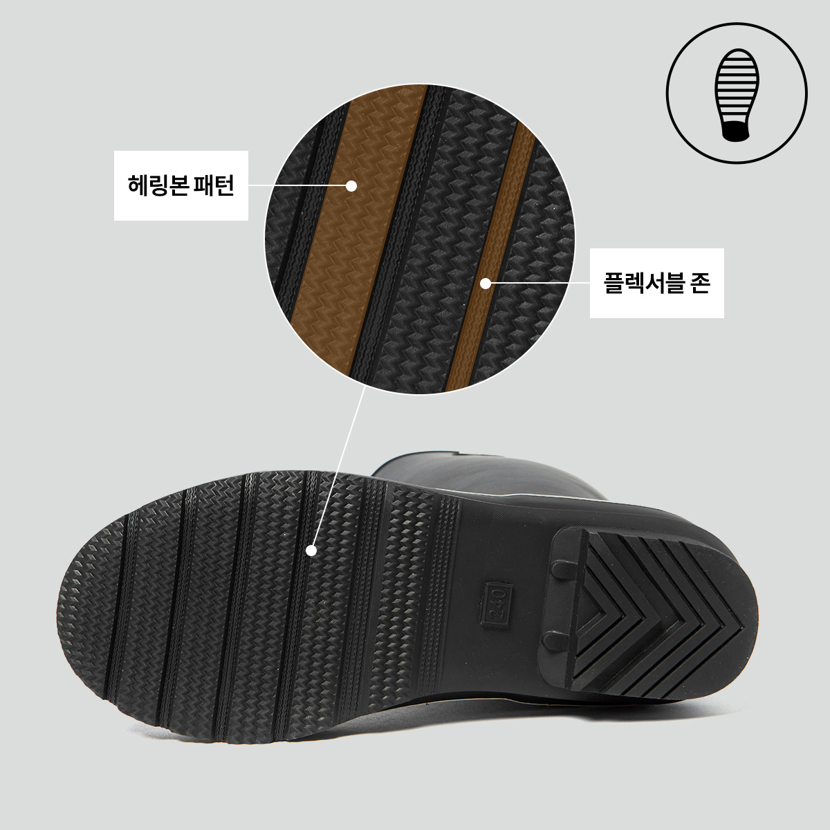 올여름의 장마 대비는 러버 레인부츠 ![]() 저가의 PVC 부츠와는 비교 불가 ![]() 지면 접지력을 높여주는 아웃솔로 ![]() 자연스러운 +4.1cm 키높이 효과 CHECK POINT