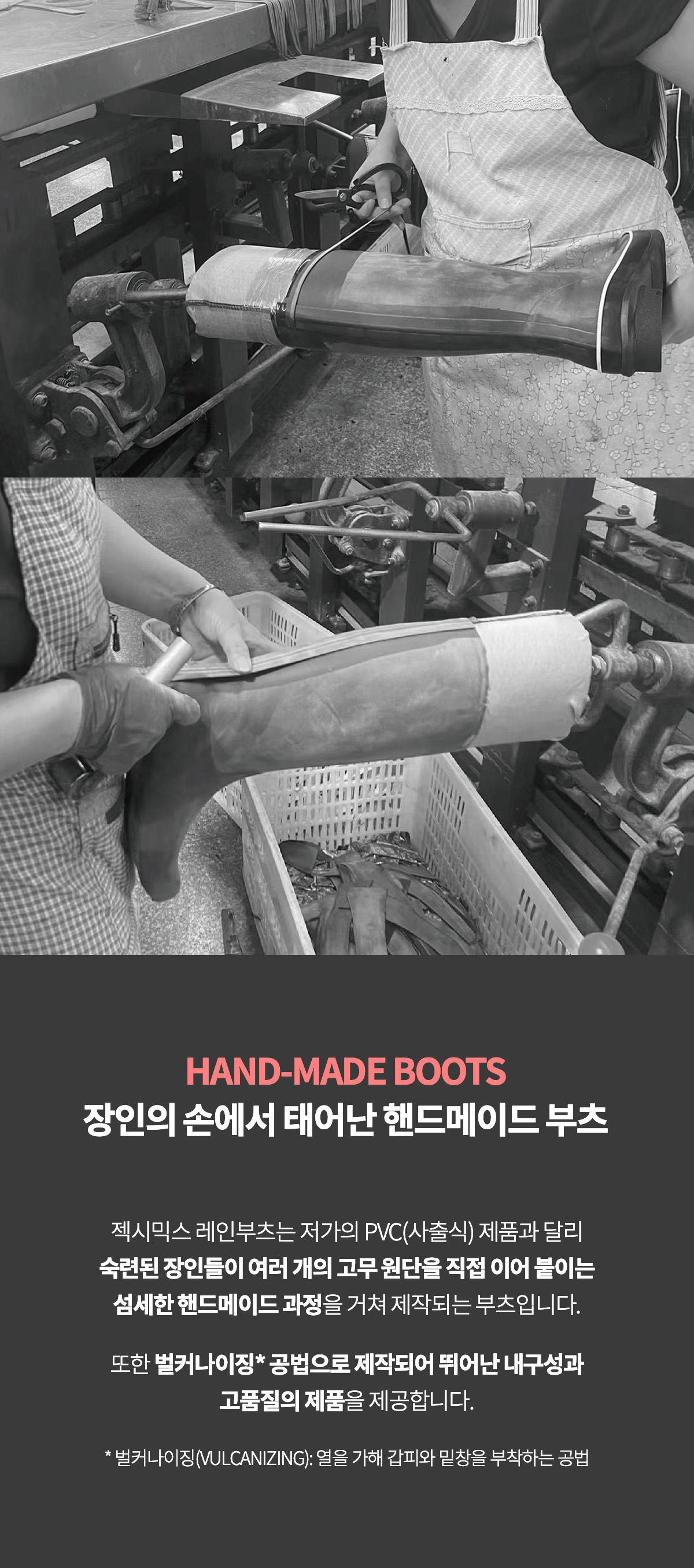 * 착용 후에는 표면의 빗물 및 오염 등을 가볍게 세척한 뒤 마른 수건으로 닦아 직사광선을 피해 보관하시기 바랍니다. * 습하거나 밀폐된 공간에 장기간 보관 시, 고무 소재의 자연스러운 특성상 부츠 표면이 하얗게 올라오는 백탁 현상이 발생할 수 있습니다. 이 경우, 중성 세제 또는 부츠 클리너를 사용하여 닦아내면 손쉽게 제거 가능합니다. ![]() |