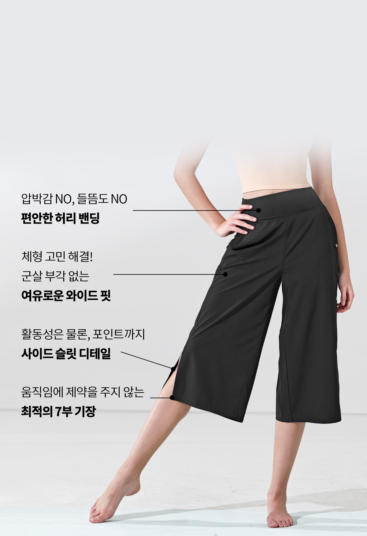 05 스타일과 활동성을 모두 갖춘, 라인이 드러나지 않는 넉넉한 와이드 핏과 무릎 아래로 떨어지는 7부 기장으로, 다양한 움직임에 제약 없이 여유로운 아웃핏을 연출해 줘요.