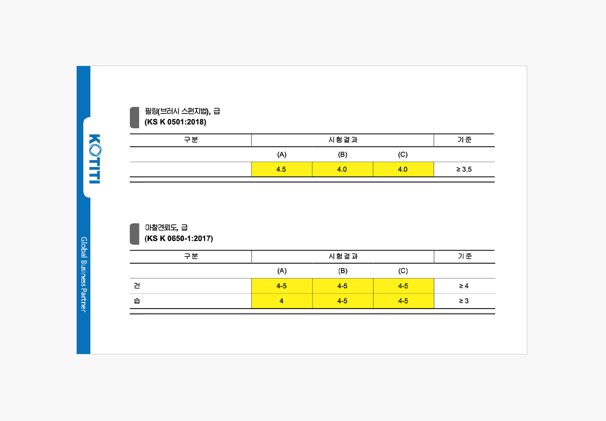 *KOTITI 시험연구원의 필링, 마찰견뢰도 테스트 완료 고딕그린