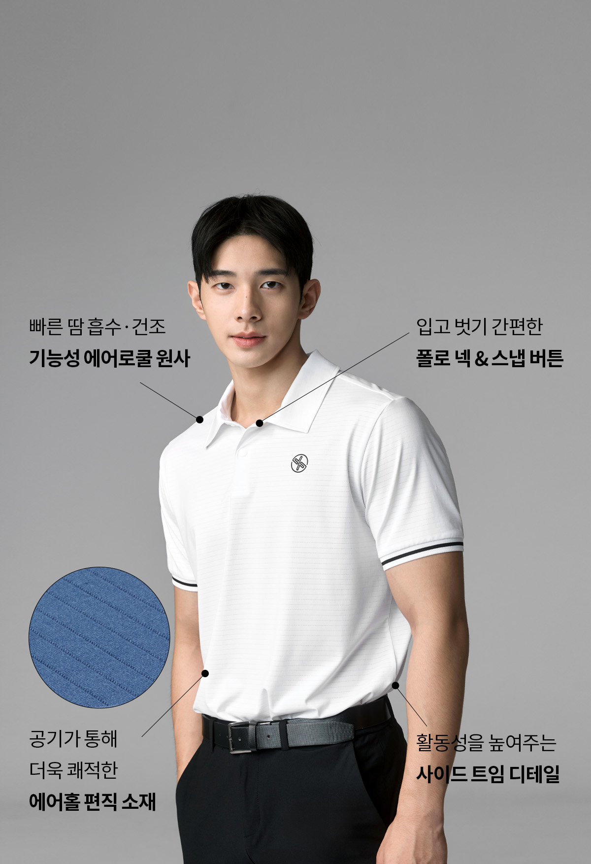 이제까지 경험해 보지 못한, 에어홀 라인 폴로 숏슬리브 ![]() 편안한 레귤러 핏과 깔끔한 디자인 ![]() 땀 흐를 새 없이 빠르게 말려주니까, ![]() 바람 솔솔 통하는 에어홀 소재로 CHECK POINT