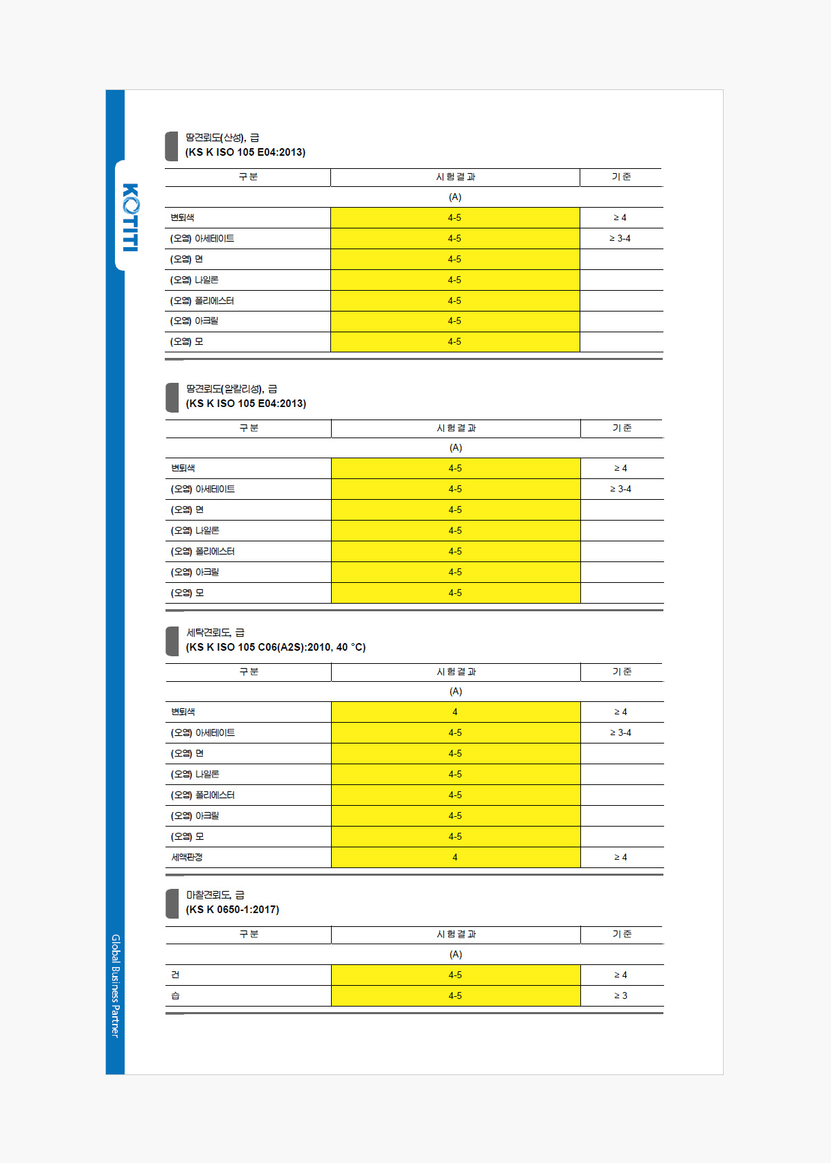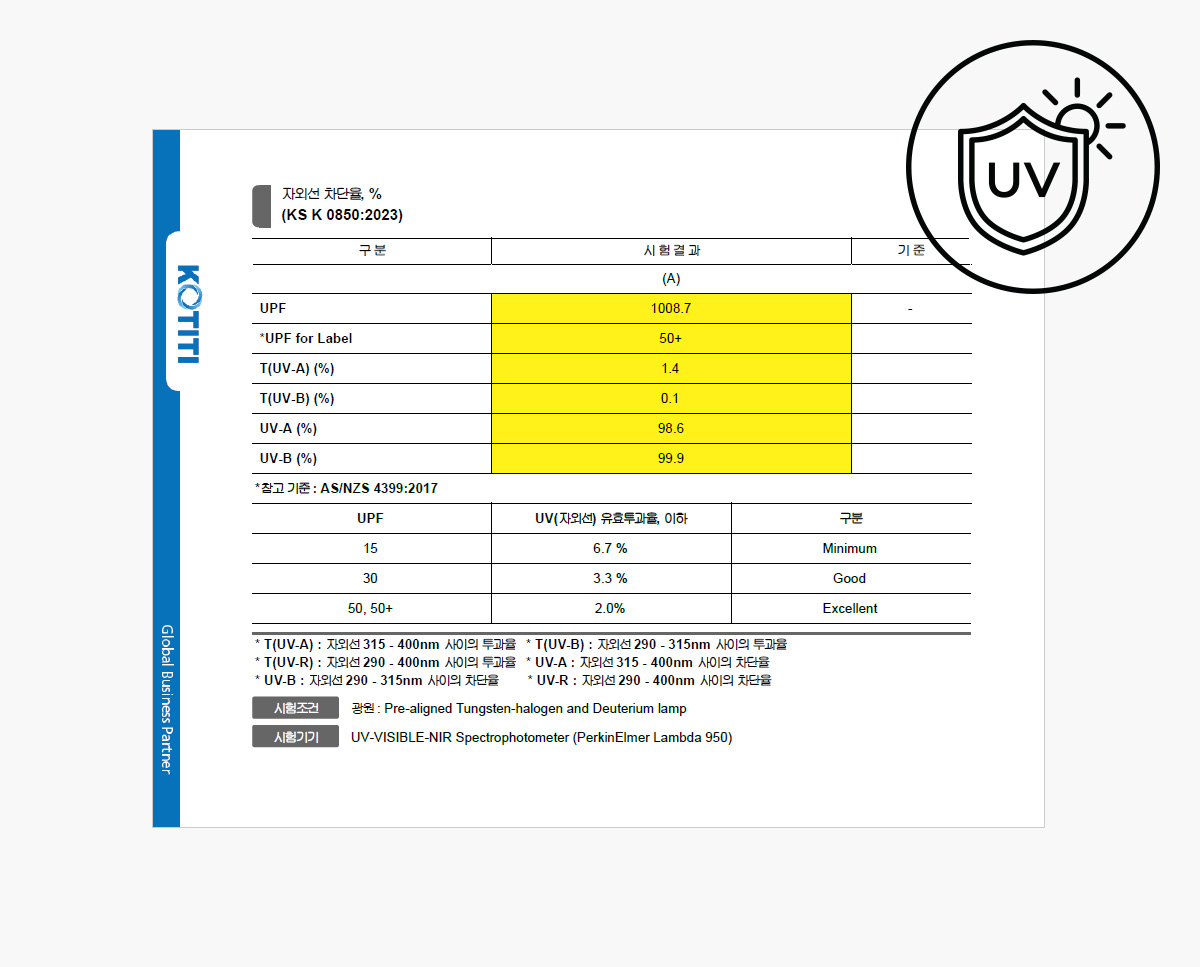 * KOTITI 시험연구원의 땀, 세탁, 마찰견뢰도 테스트 완료