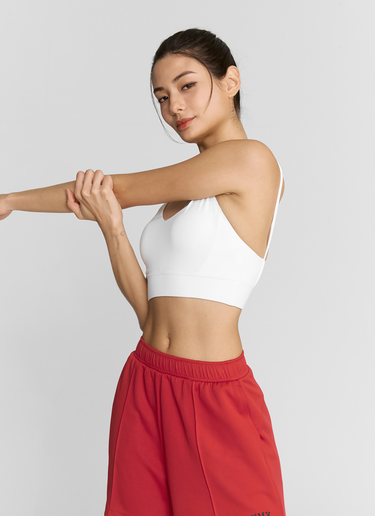 04 "팔을 들어 올려도 제자리에!" 브라 밑단에 신축성이 좋은 밴드를 내장하여, 팔을 올리는 동작 시에도 말려 올라감 없이 안정적인 지지력을 선사해요.