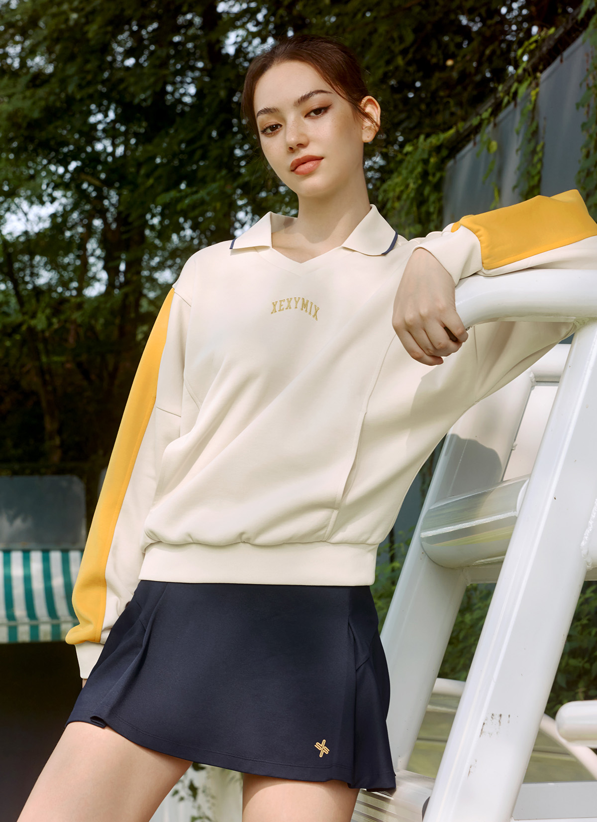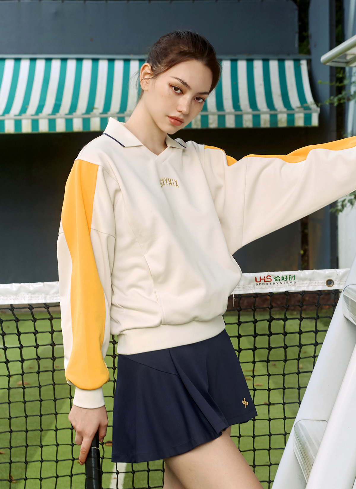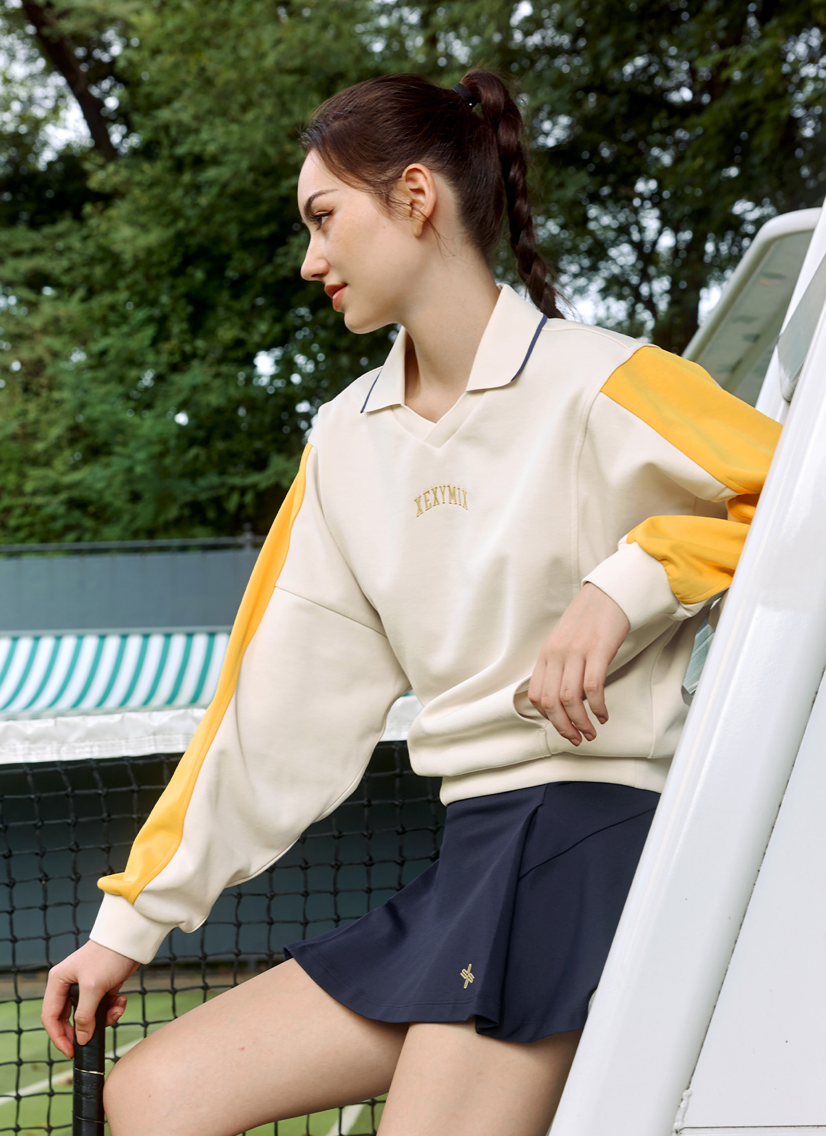 XTFMT04J3 Colorblock Color Man to Man Milk Tea Beige top