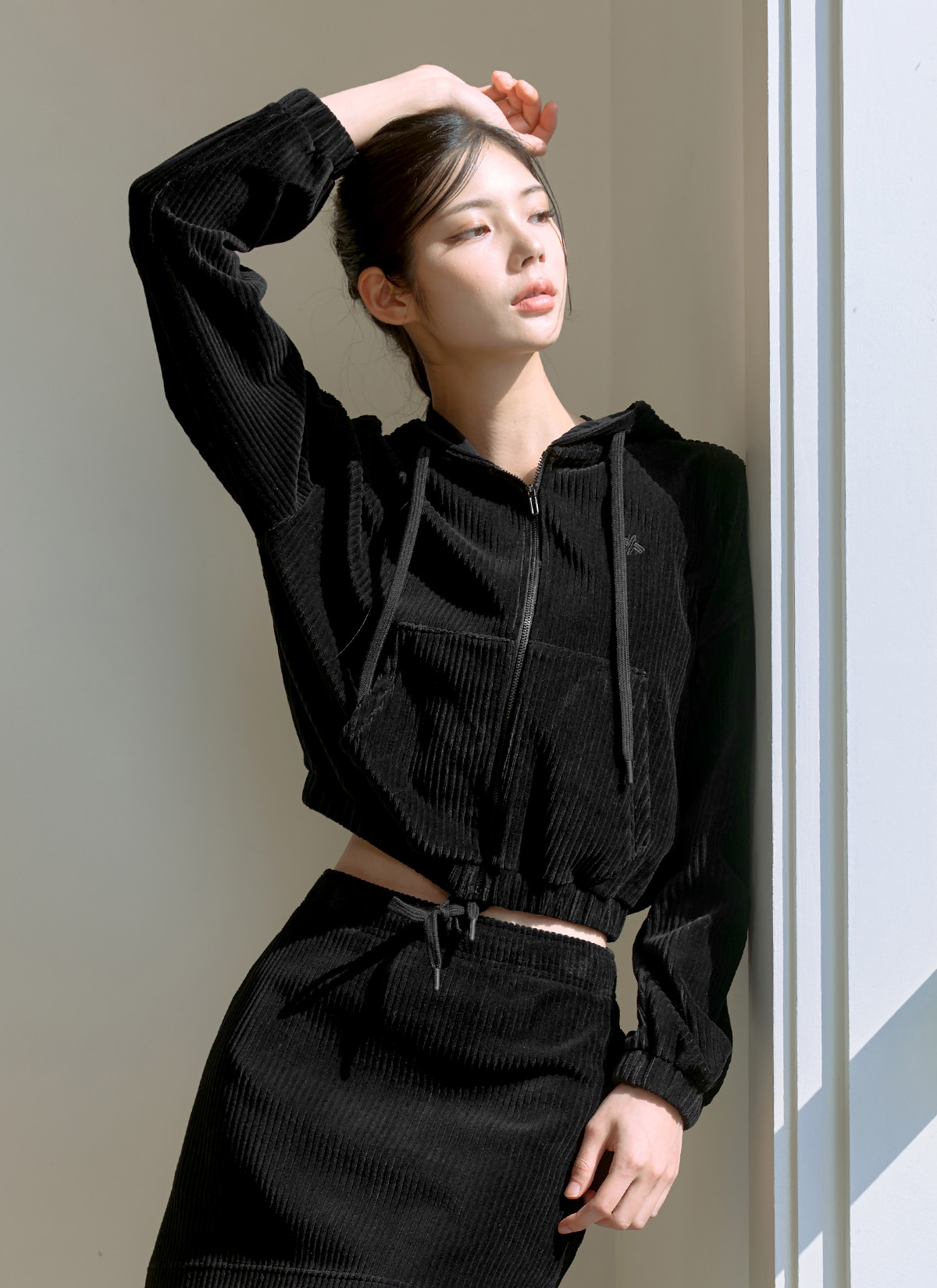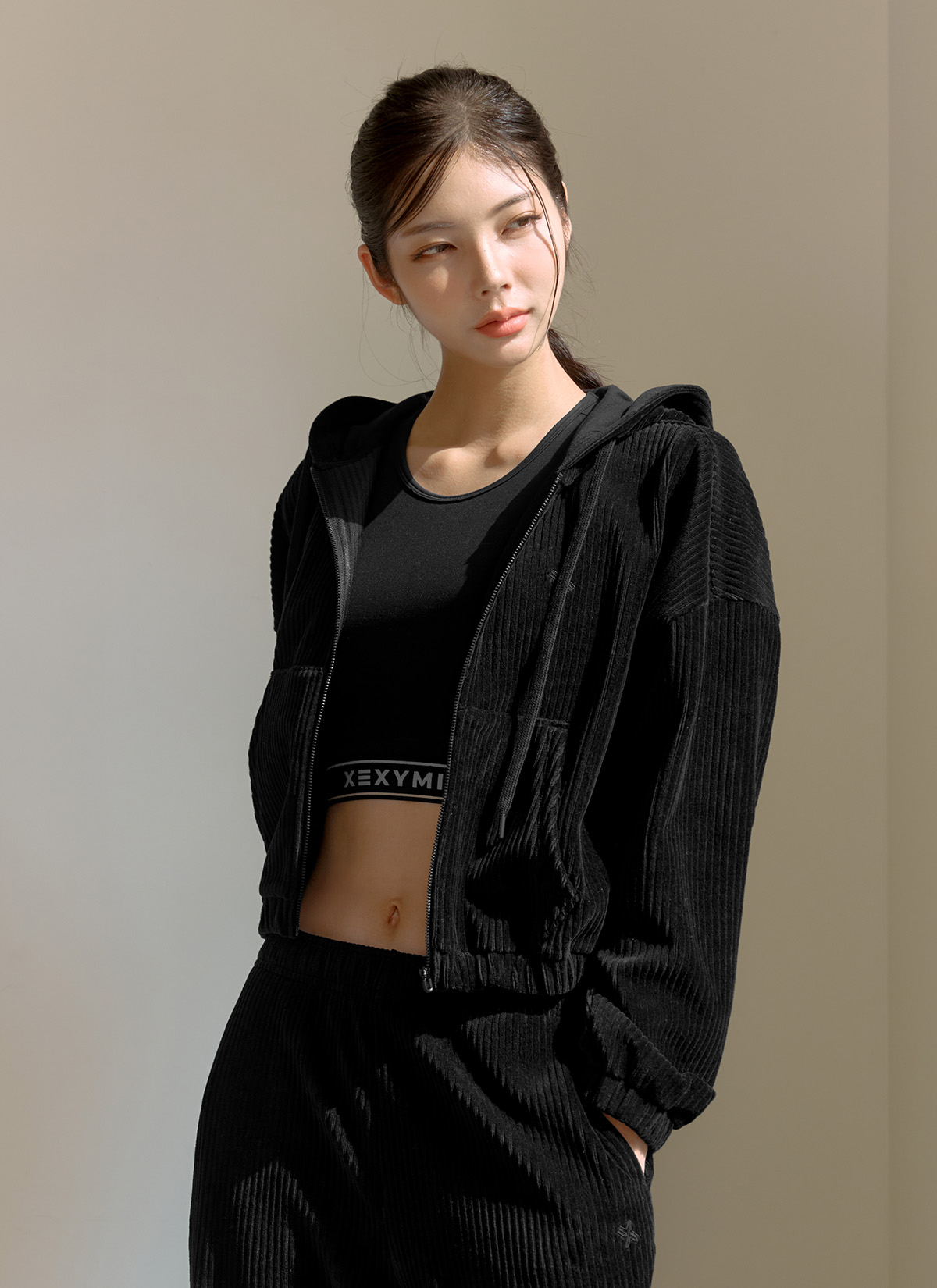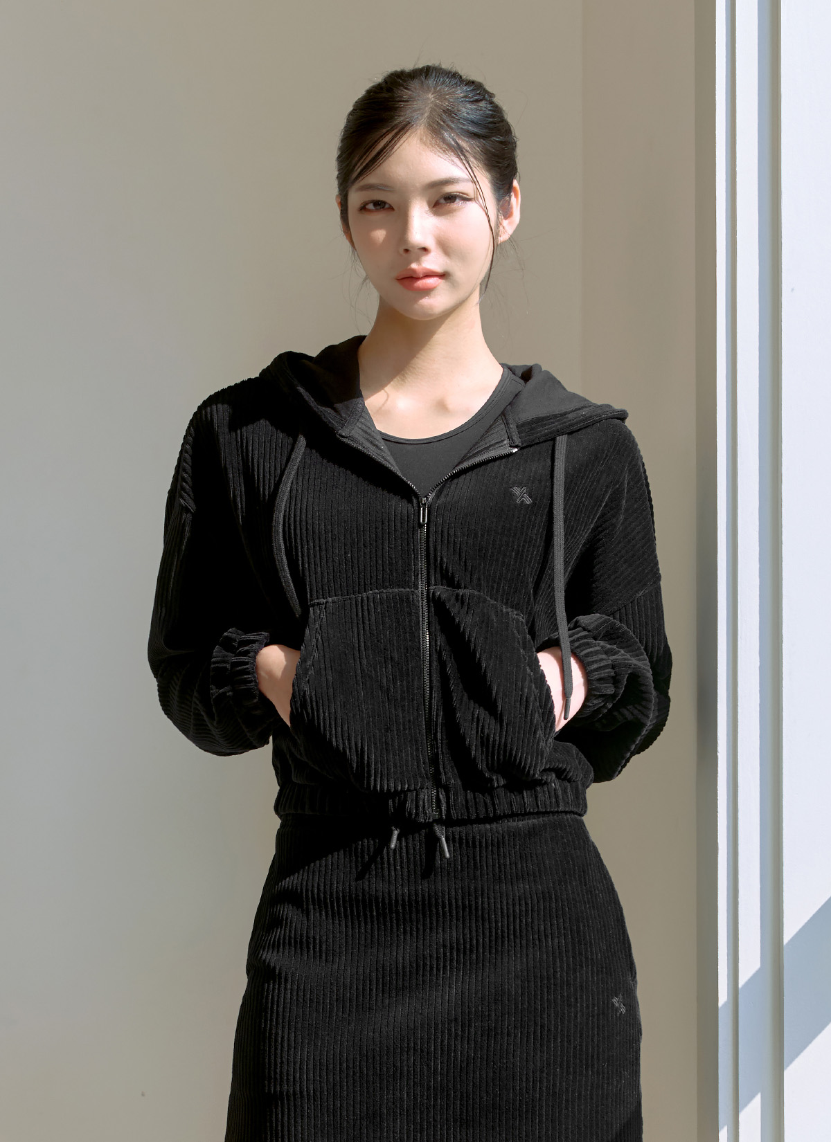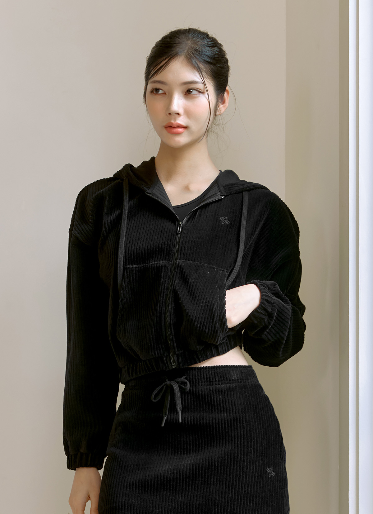 XTFGJ14J3 Corduroy Hood Zip up Black Top