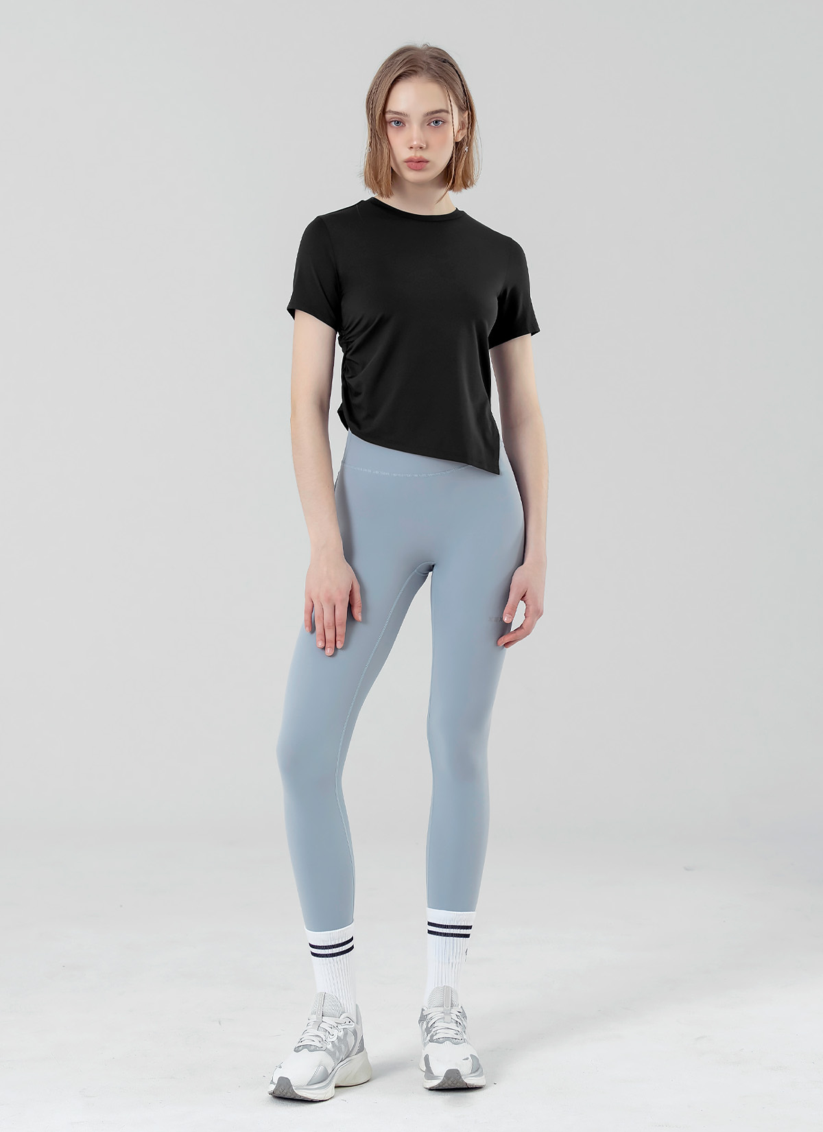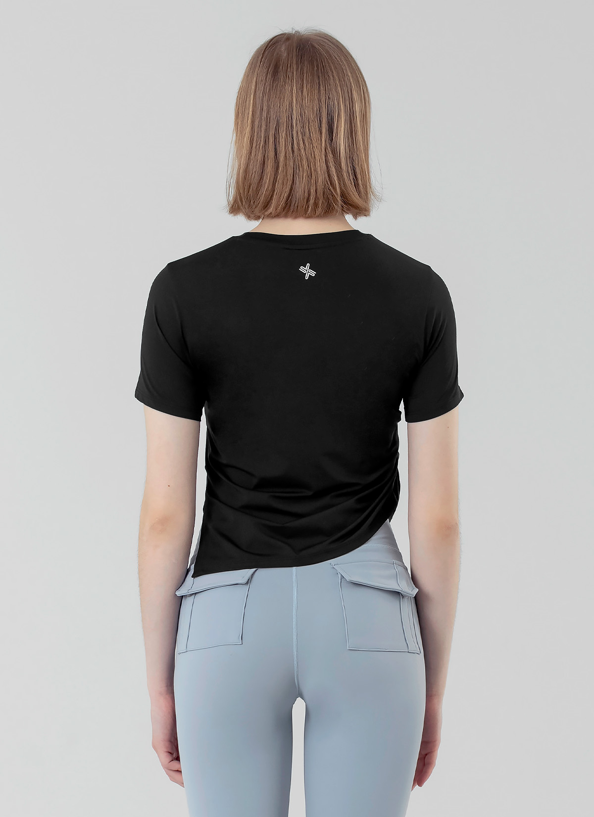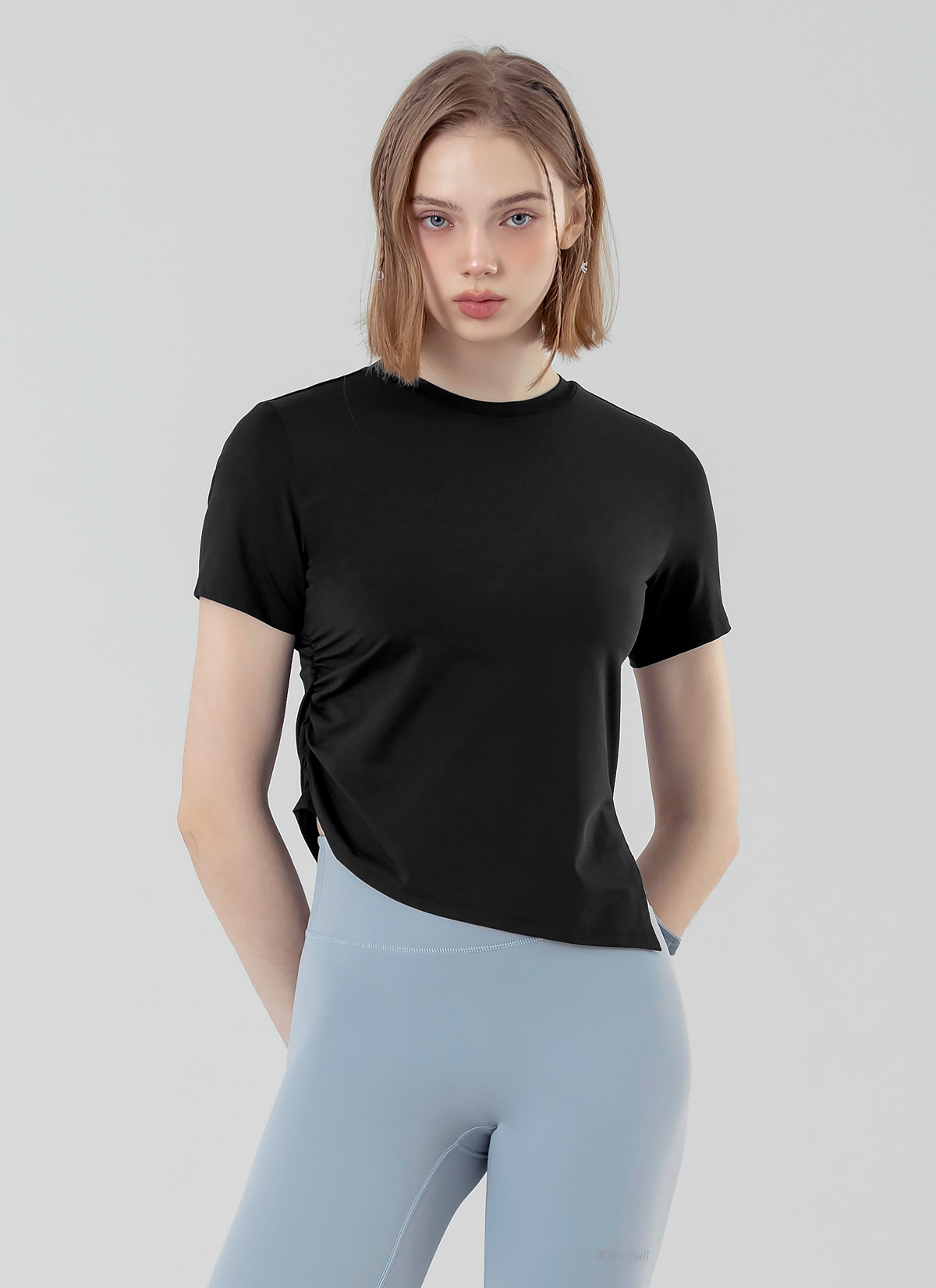 XFK2TS1004 Unbalanced Side Shirring Short Sleeve Black TOP