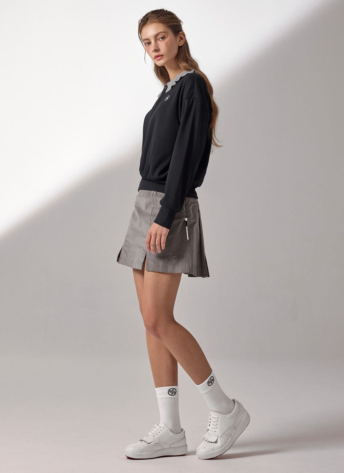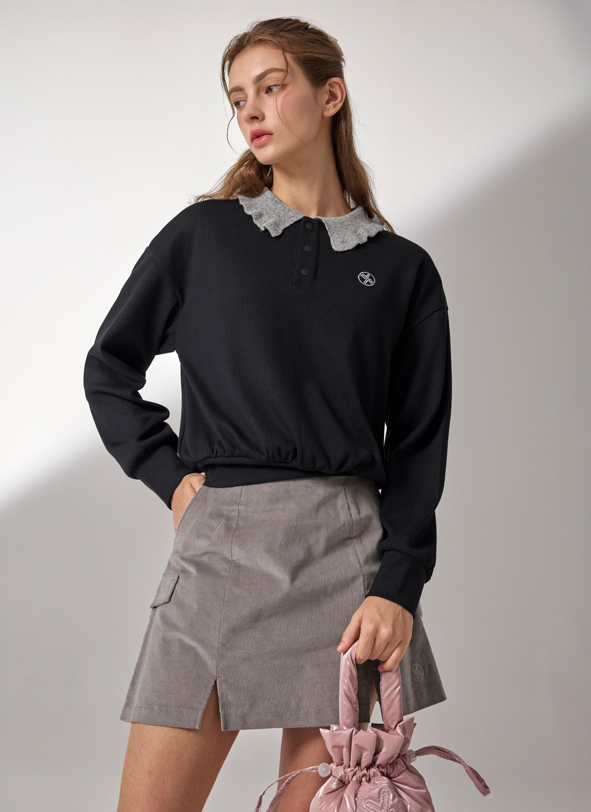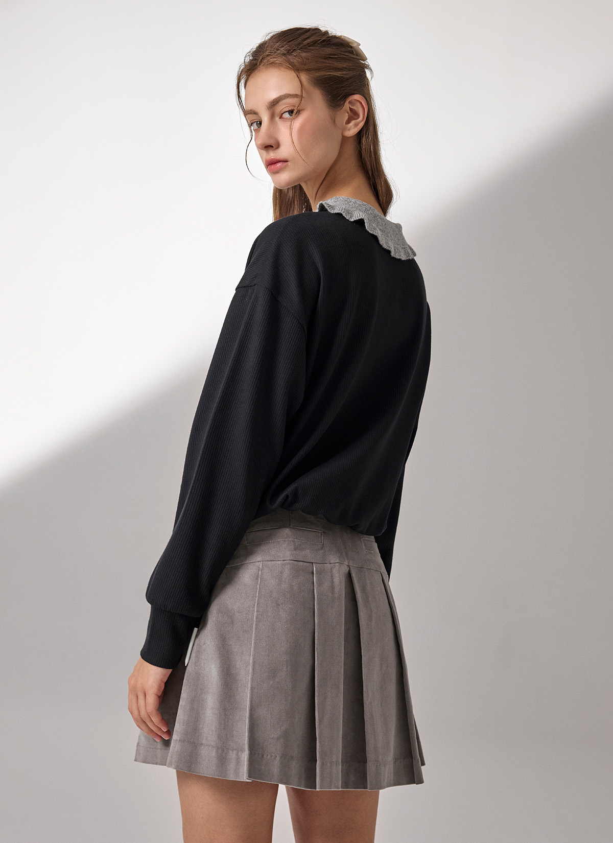 XFK3QL1202 Ribbed Ruffle Collar Long Sleeve TOP