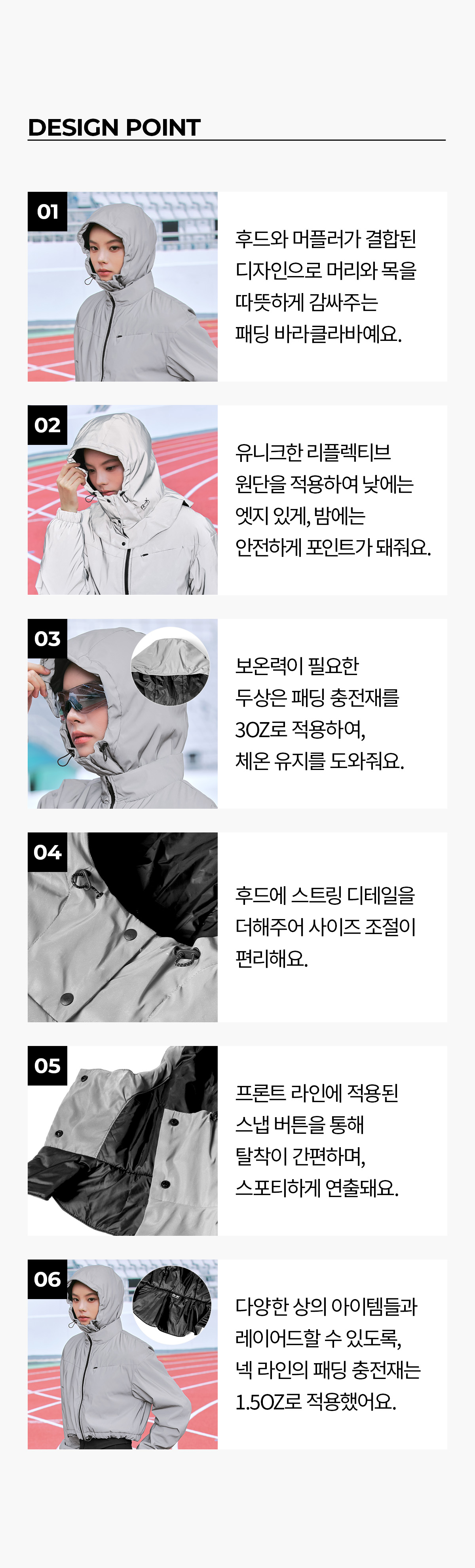 * 마찰이나 접합이 반복될 경우 반사 코팅이 손상될 수 있으니 옷걸이에 보관하는 것을 권장합니다. * 세탁 시 뒤집어서 손세탁 하는 것을 권장하며 건조 시 직사광선을 피해 서늘한 그늘에서 자연건조해 주세요. * 표백제나 강한 세제를 사용하면 반사 기능이 저하될 수 있으니 중성세제를 사용하여 가볍게 손세탁해 주세요.