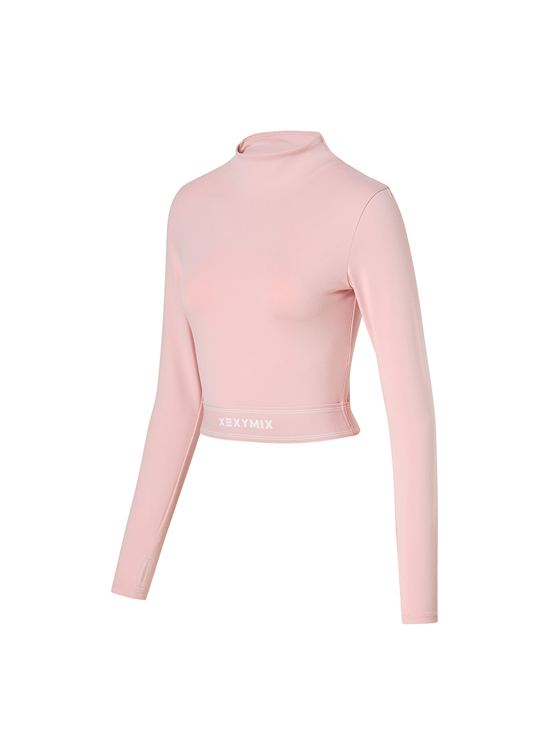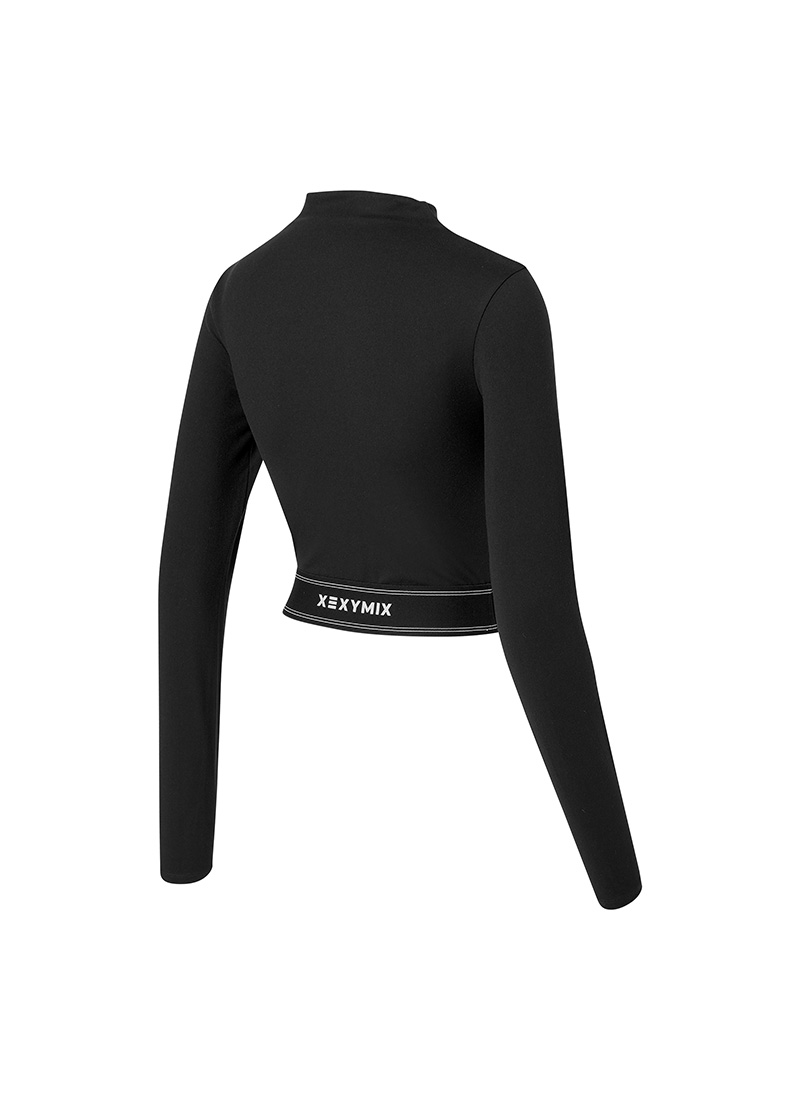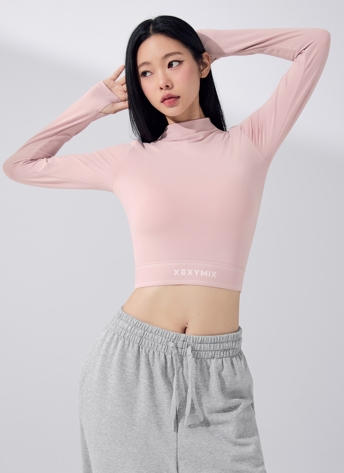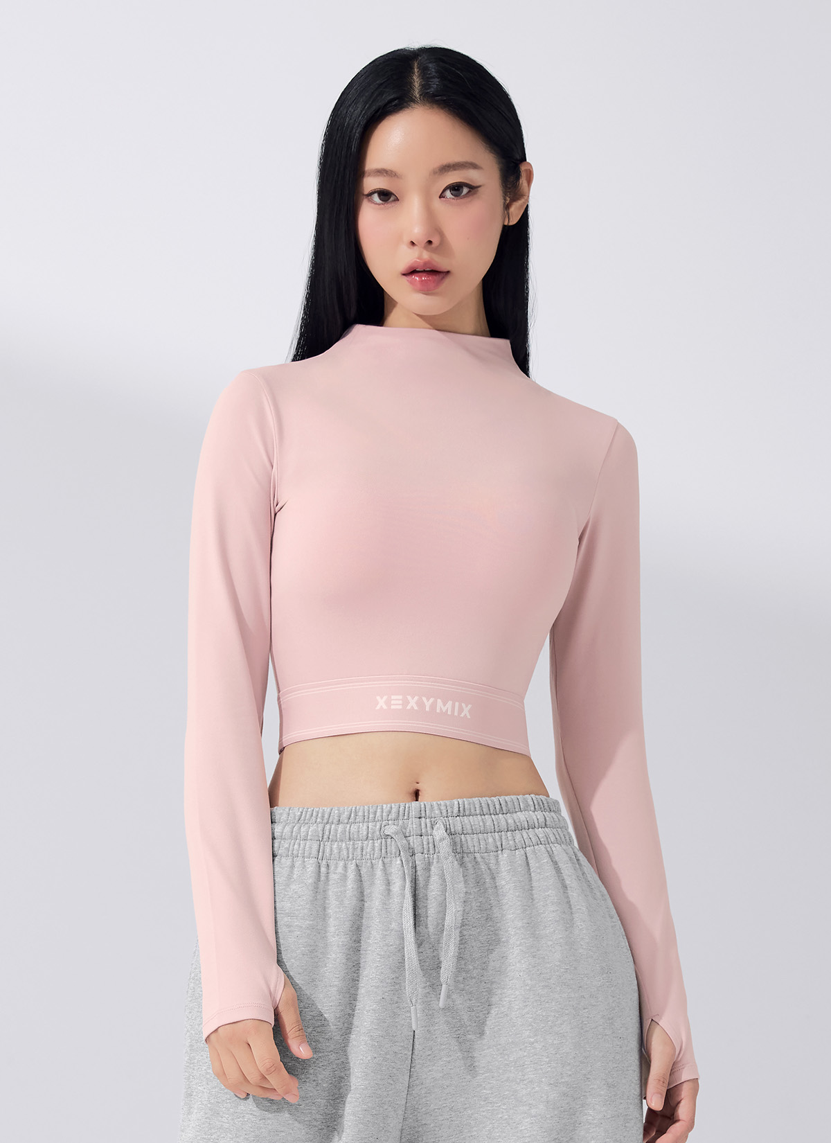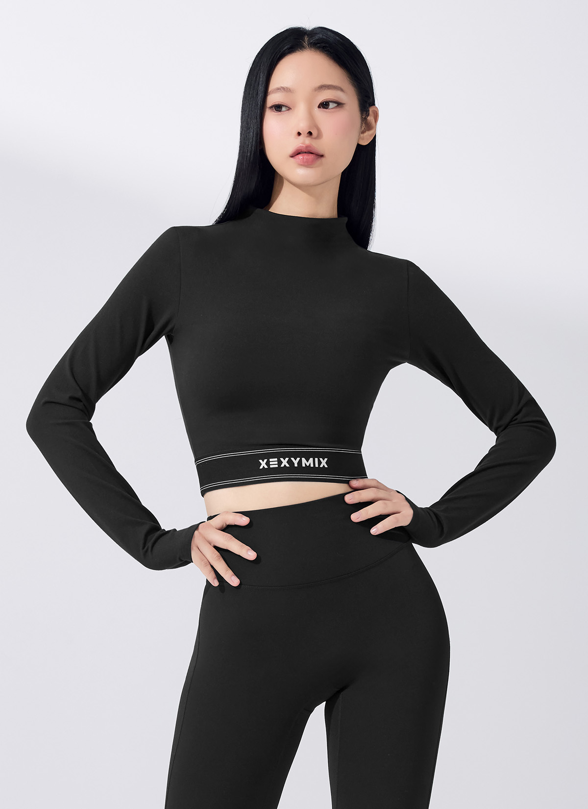 XFK4TL1001 Soft Logo Banding Mock Neck Long Sleeve Top