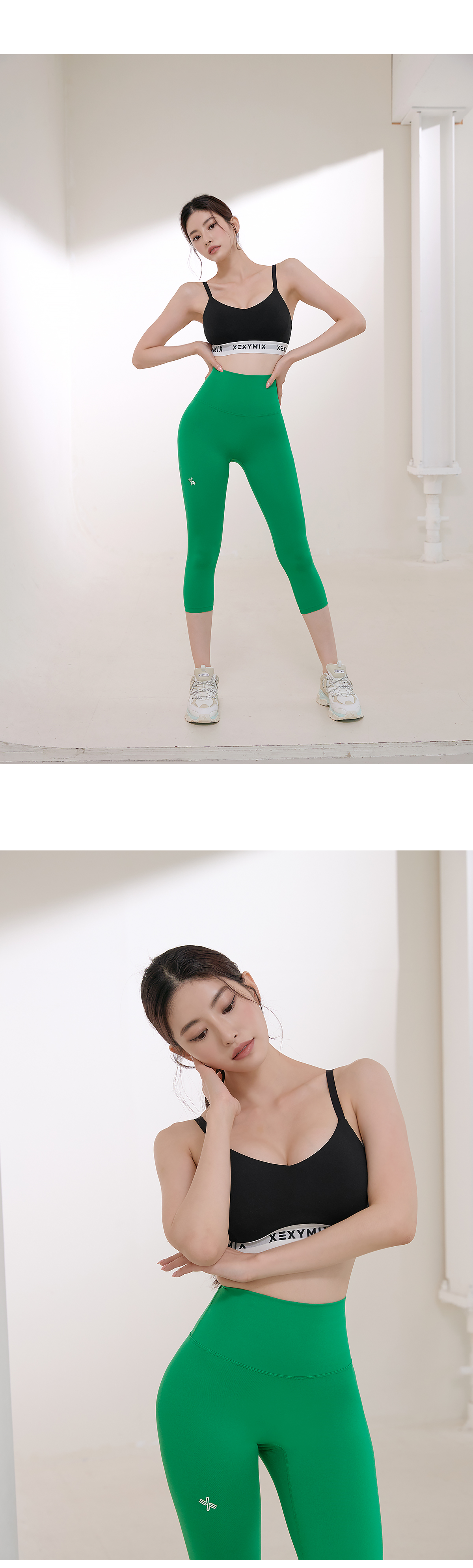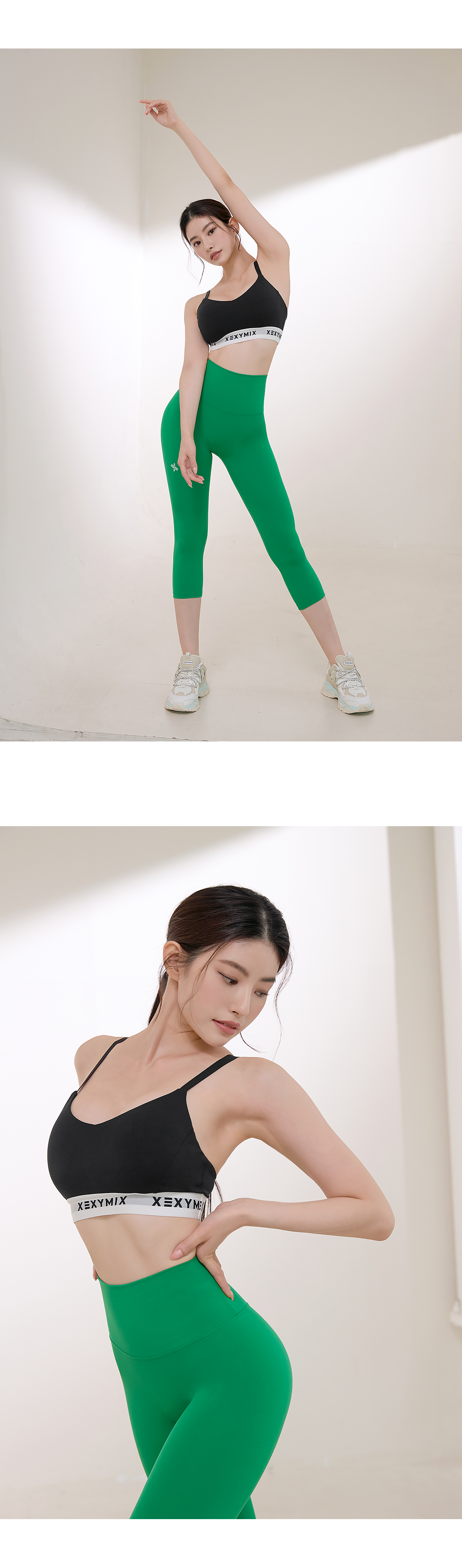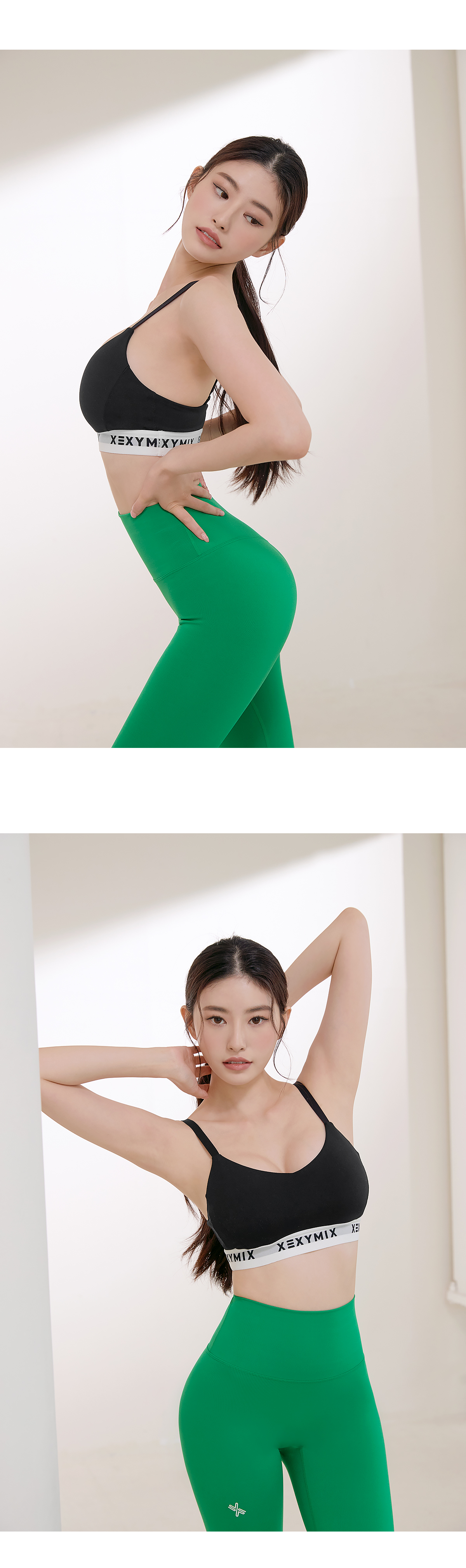 밑단에 젝시믹스의 로고가 들어간 두툼한 밴드를 삽입하여 액티브한 움직임에도 안정적으로 잡아주며 바디를 탄탄하면서도 부드럽게 감싸줘요.
