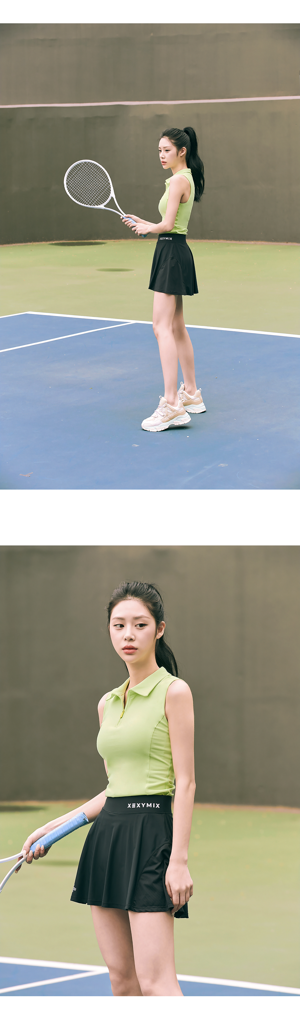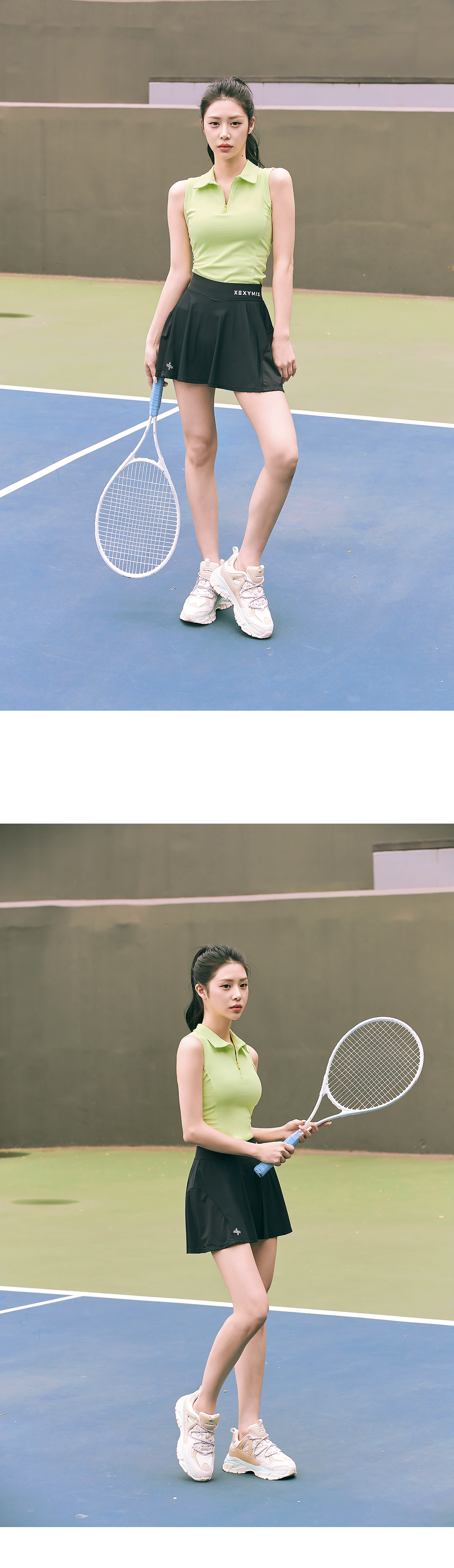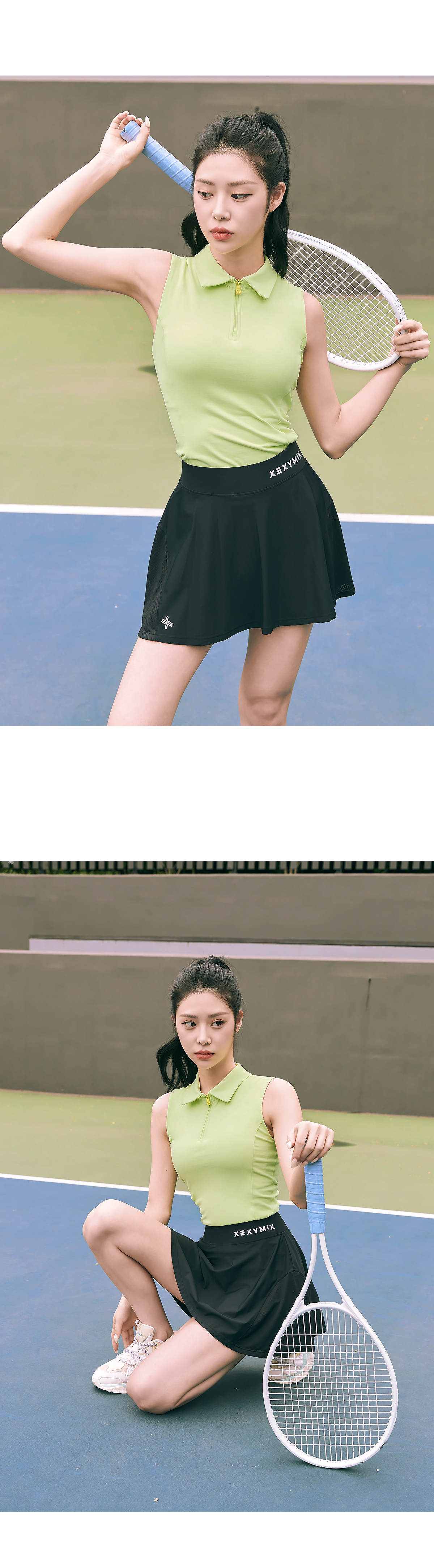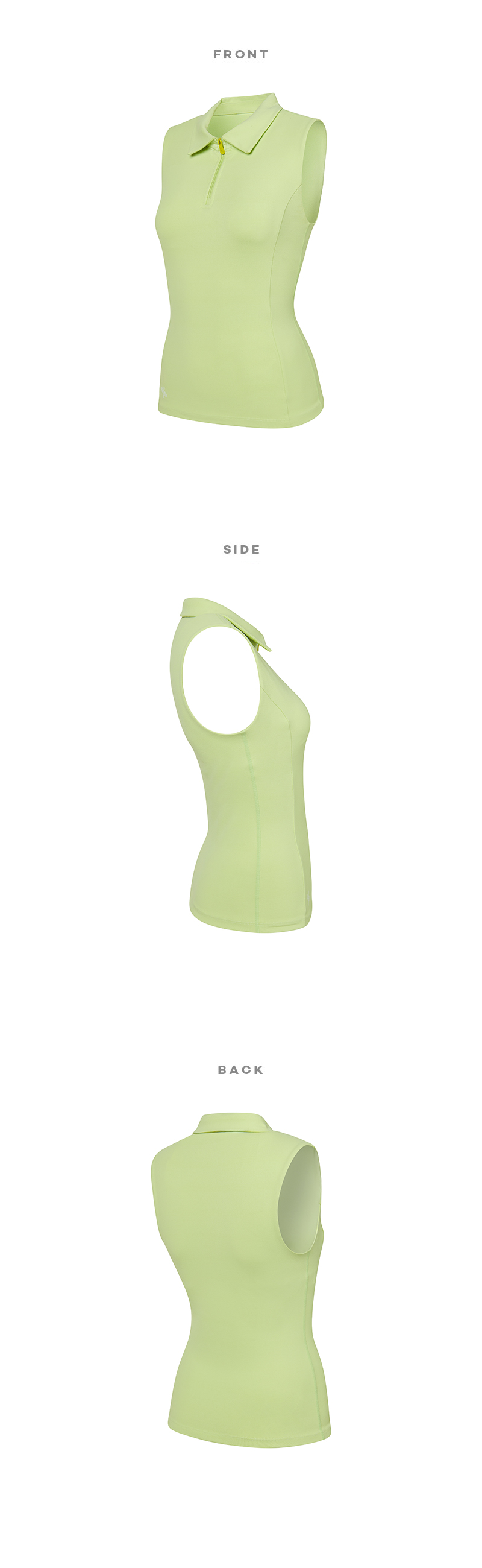 테니스웨어나 골프웨어, 때로는 데일리룩으로도 캐주얼하게 입을 수 있는 카라 슬리브리스 탑이에요. 코튼과 같은 부드러운 촉감의 고급 요가복 소재인 나일론 스판을 활용하여 땀을 빨리 흡수하고 건조해 주어 활동적인 운동 시에도 쾌적하게 착용할 수 있어요 베이직한 카라 넥에 바스트 라인까지 내려오는 하프 집업을 삽입하여 오픈 클로징이 간편하고 쉽게 스타일 변경이 가능해요. 상체를 타이트하게 잡아주어 움직임에 따라 들뜸 현상이 없고 암홀에서부터 유선형 라인으로 떨어지는 프린세스 절개 라인이 더욱 슬림한 허리라인을 만들어줘요. 골반 선까지 내려오는 베이직한 기장과 슬리브리스 디자인으로 파워풀한 스윙도 자유롭게 할 수 있고 노출 걱정을 덜 수 있어요. 패드를 탈착할 수 있는 브라 홀이 있어 별도의 이너 없이 간편하게 입을 수 있어 활동성을 높여줘요.