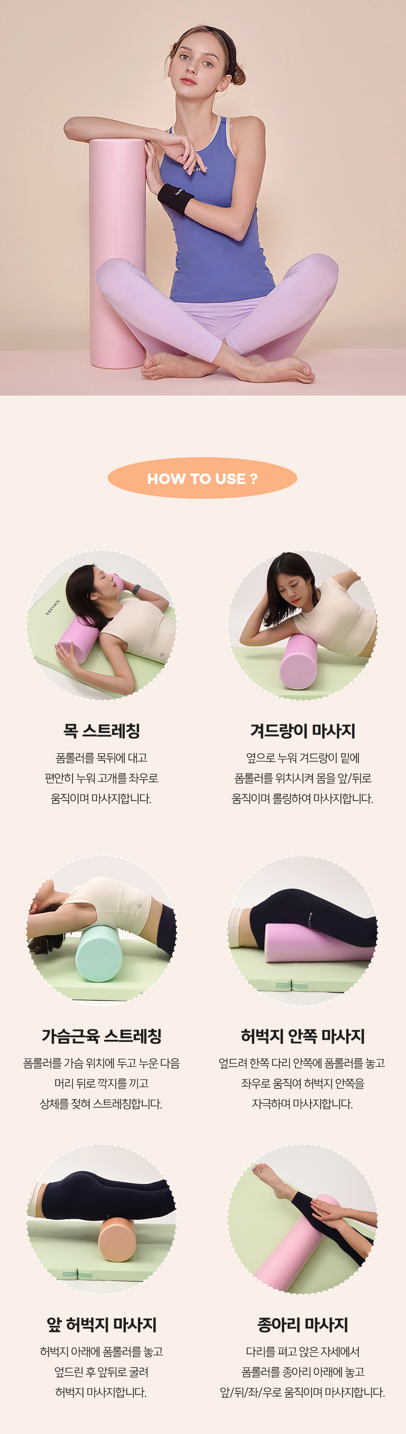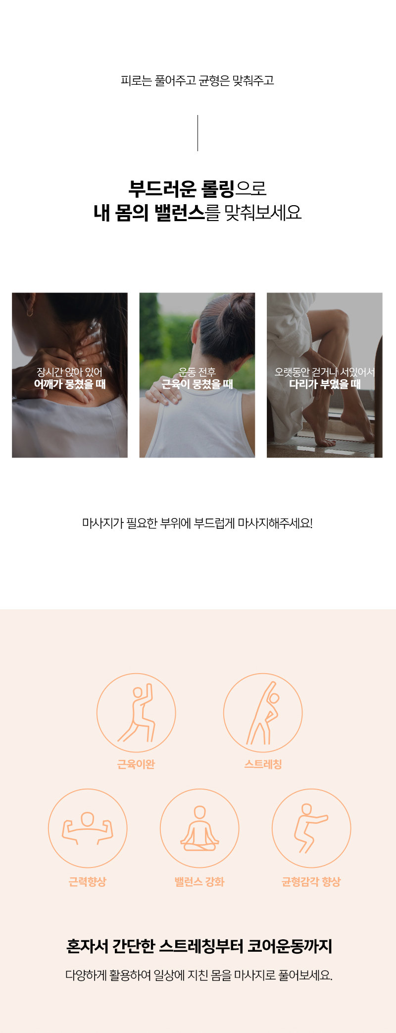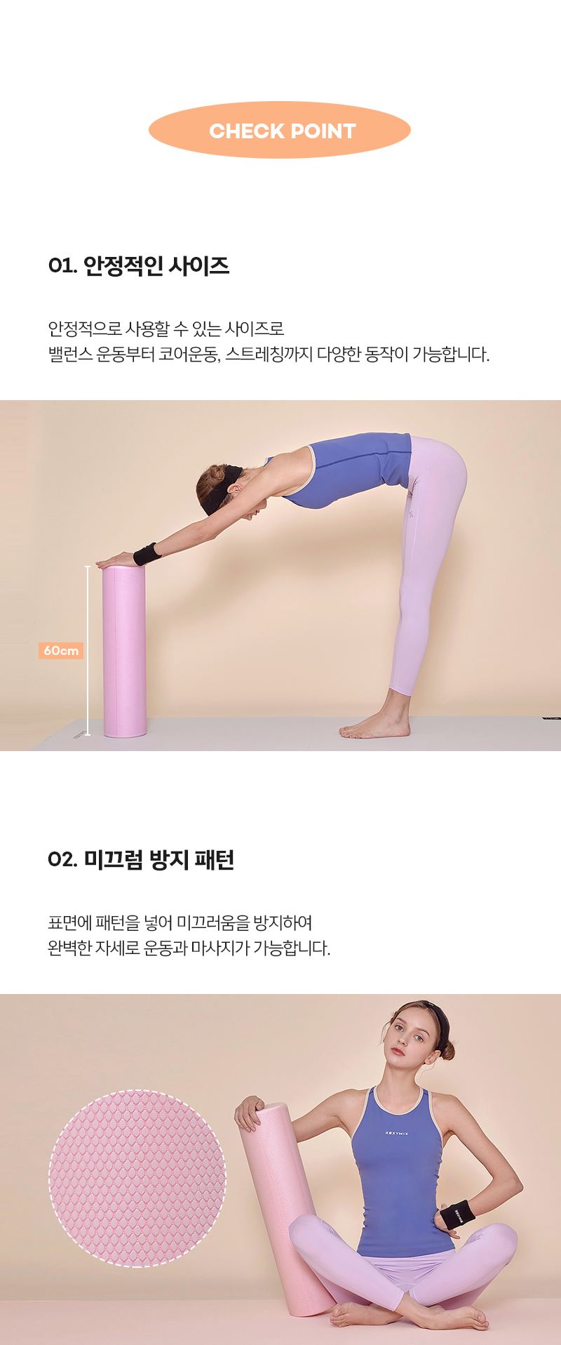 부드러운 롤링으로 내몸의 밸런스를 맞춰줄 수 있는 젝시믹스 밸런스폼이에요 안정적으로 사용할 수 있는 사이즈로 밸런스 운동부터 코어운동, 스트레칭까지 다양한 동작이 가능하며 표면에 패턴을 넣어 미끄러움을 방지하여 완벽한 자세로 운동과 마사지가 가능해요 인체에 무해한 성분으로 만들어졌으며, 유해 물질 테스트를 통과한 안전한 제품으로 안심하고 사용할 수 있어요 파스텔톤의 4컬러의 라인으로 기분 좋게 마사지할 수 있어요