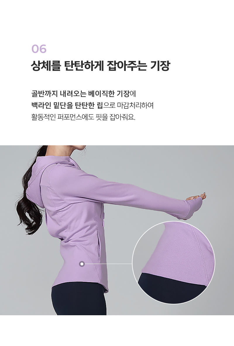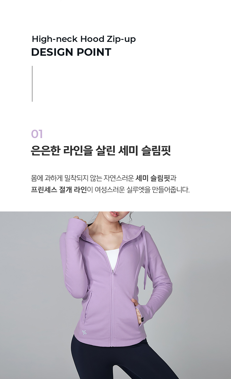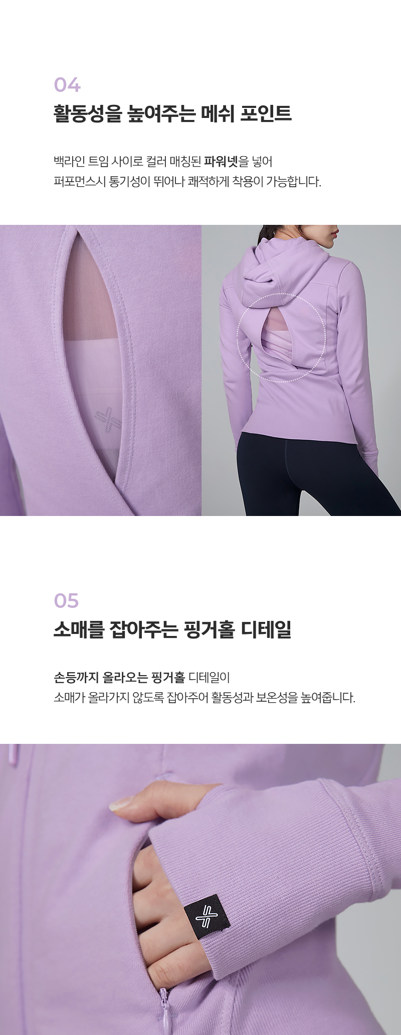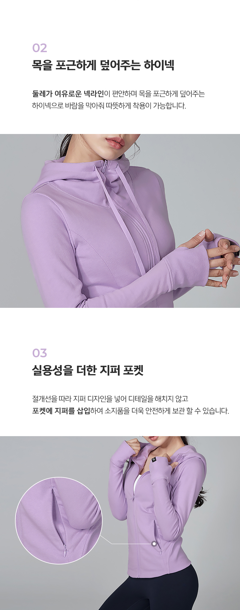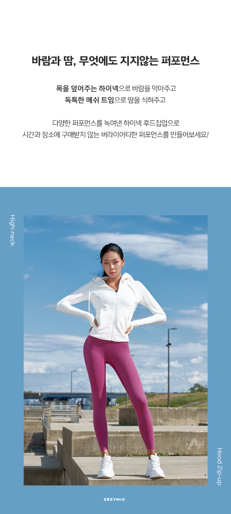 목 위로 올라오는 하이넥과 실용적인 뒷판 매쉬 트임으로 퍼포먼스 시 보온성과 통기성을 동시에 만족시켜주는 후드 집업이에요. 부드러운 코튼을 함유하여 피부에 닿는 감촉이 얇고 산뜻하고 텐션감을 더해 다양한 운동 시에도 활용도 높게 입을 수 있어요. 둘레가 넉넉한 하이넥 넥라인으로 디자인하여 목에 배기는 부분 없이 편하게 착용할 수 있고, 둘레 조절이 가능한 스트링을 삽입하여 보온성을 한층 더 높여줘요. 백라인 트임에 원단 컬러와 매칭된 파워넷 원단이 더욱 포인트를 만들어주고 통기성을 높여줘요. 프론트에는 프린세스 절개선을 따라 들어간 지퍼 포켓을 넣어 소지품을 더욱 안전하게 보관할 수 있어요. 소매와 밑단은 립으로 마감하여 형태를 안정적으로 유지해주고 옷의 완성도를 높여줘요. 골반까지 오는 기장으로 상체를 탄탄하게 잡아주고 소매 끝에 핑거 홀을 추가하여 다양한 퍼포먼스에도 더욱 안정감 있게 착용할 수 있어요. 다양한 퍼포먼스를 녹여낸 하이넥 후드집업으로 바람과 땀, 무엇에도 지지 않는 퍼포먼스를 완성해보세요!